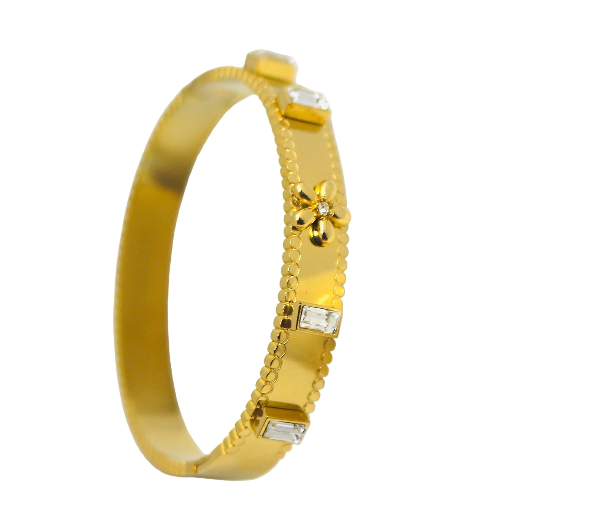 Adorned with sparkling baguette-cut cubic zirconia stones and a delicate floral motif at the center. The textured edge detailing adds a modern twist, making it a perfect blend of elegance and contemporary design for both everyday wear and special occasions.