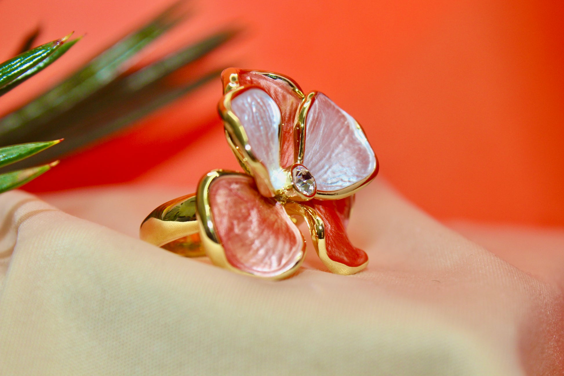 Step into elegance with this Blossom Enamel Floral Ring — a true statement piece that radiates charm and grace. Featuring delicate pink and pearly white petals outlined in gleaming gold, this ring brings a touch of spring to your everyday style. A sparkling crystal at the center completes the look with a hint of luxury, making it perfect for both casual wear and special occasions.