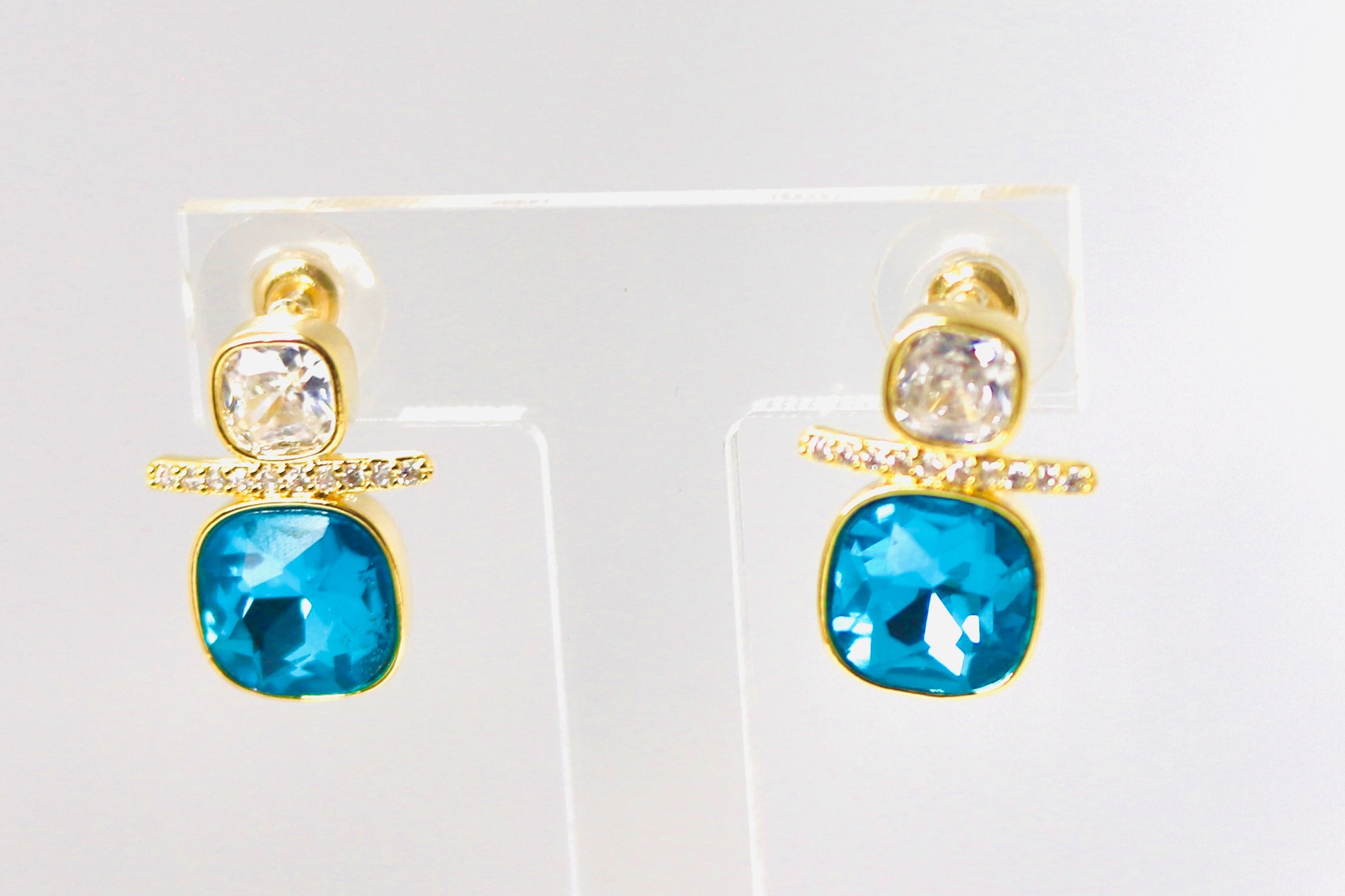 These elegant stud earrings feature a striking cushion-cut deep blue crystal paired with a sparkling clear zirconia stone. The stones are set in a sleek gold-plated frame, divided by a row of delicate white cubic zirconia accents, adding extra brilliance. Perfect for both everyday elegance and special occasions, these earrings combine modern design with timeless sparkle.