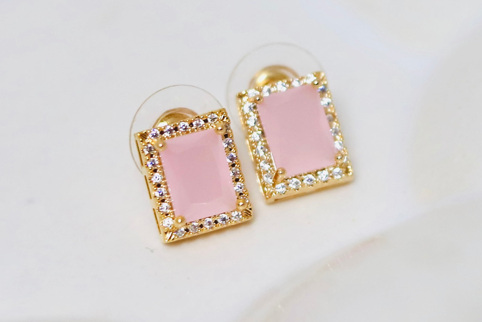 These graceful stud earrings feature a rectangular blush-pink stone framed by a sparkling halo of clear crystals. The gold-plated setting enhances the soft pastel hue, creating a delicate yet luxurious look. Perfect for everyday sophistication or special occasions, these earrings add a touch of romance and charm to any outfit.
