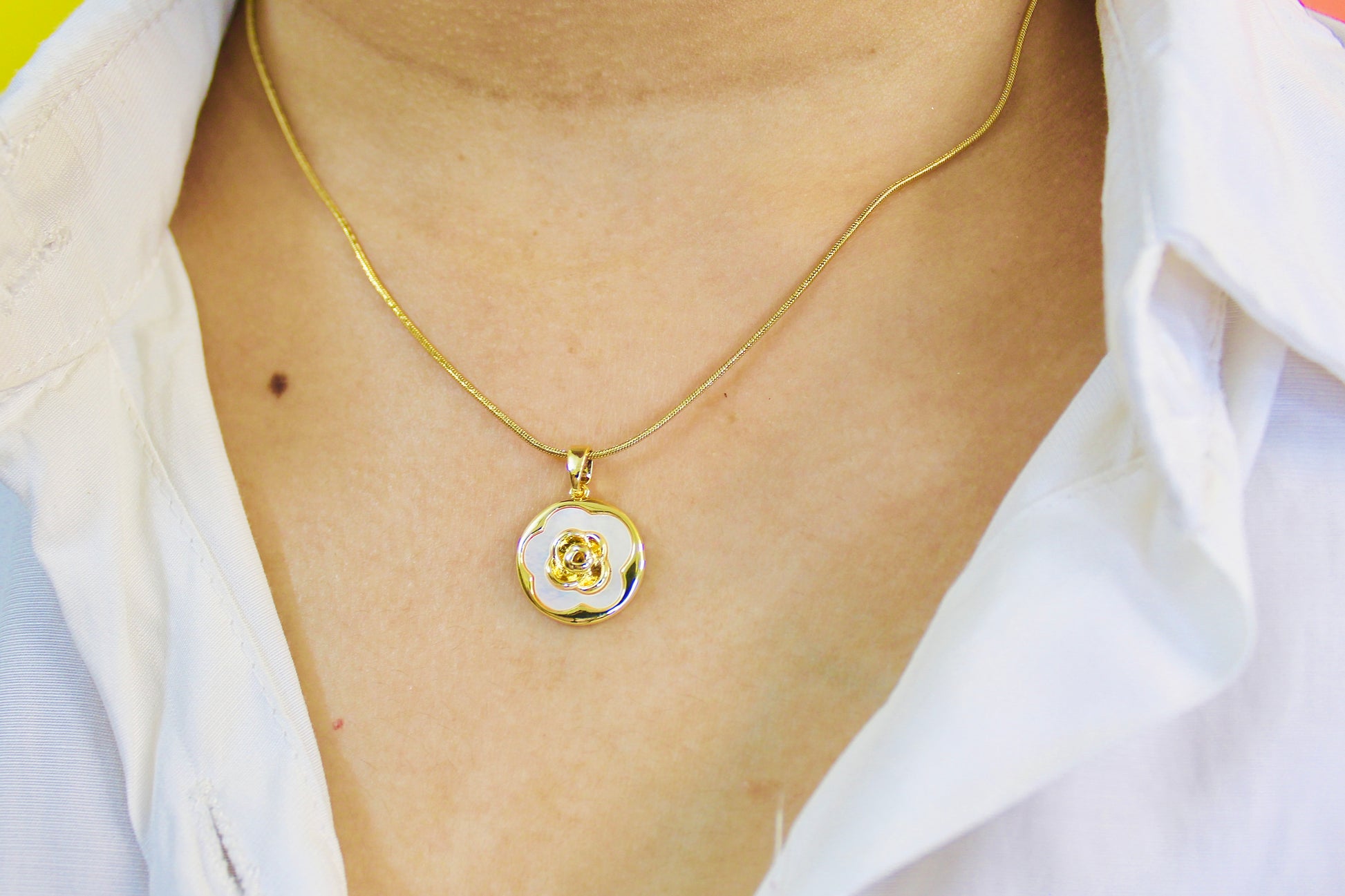 A timeless and elegant necklace featuring a gold-plated chain with a beautiful round floral pendant. The pendant showcases a delicate flower design with a mother-of-pearl effect, making it a versatile accessory for both everyday wear and special occasions.