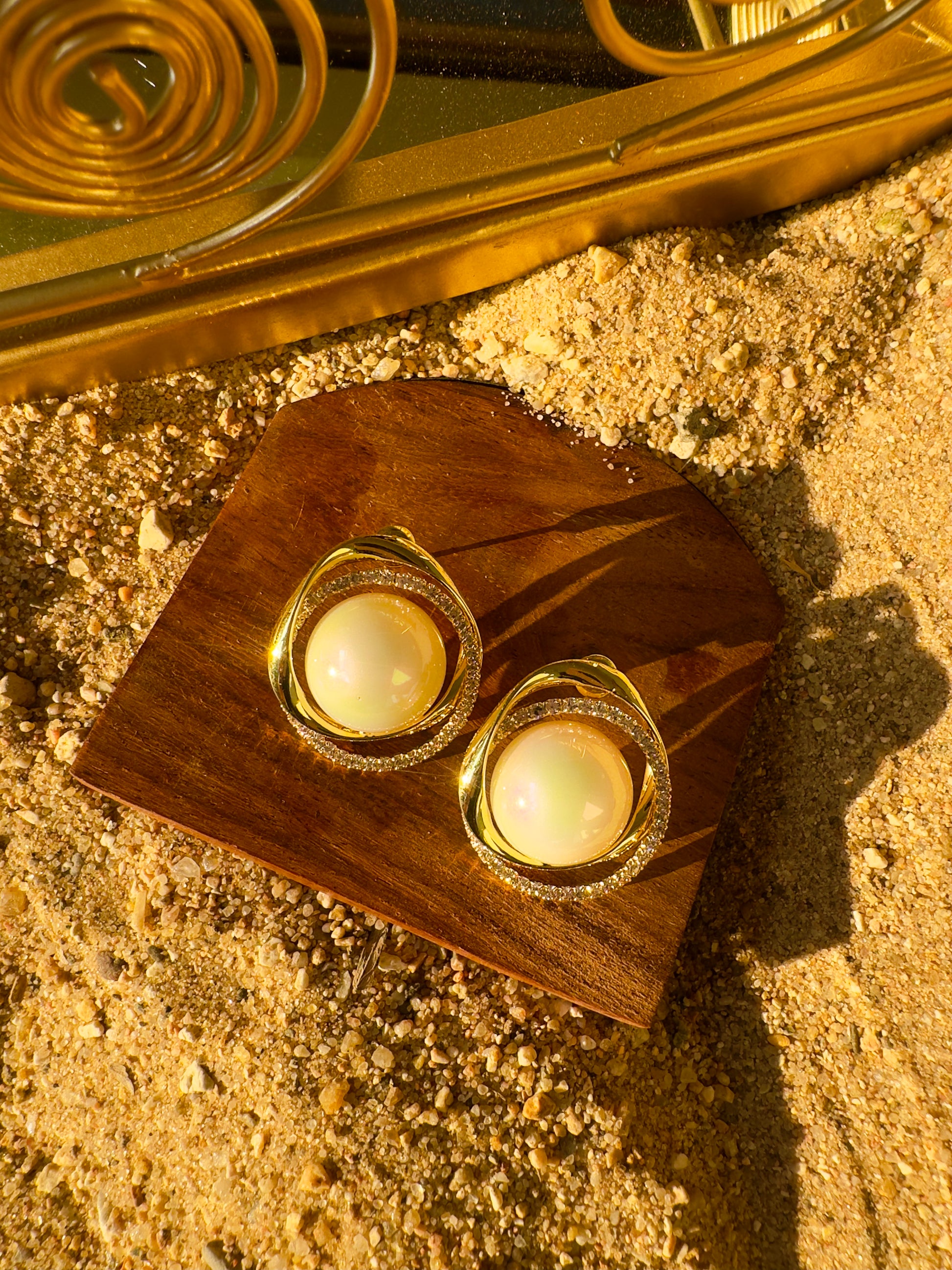 Inspired by the allure of cosmic beauty, the Celestial Orbit Studs feature a radiant pearl-like center encircled by a shimmering halo of crystals and gold-toned curves. These earrings effortlessly blend elegance with a hint of drama—perfect for day-to-night transitions. A must-have for those who believe in dressing like the universe revolves around them.