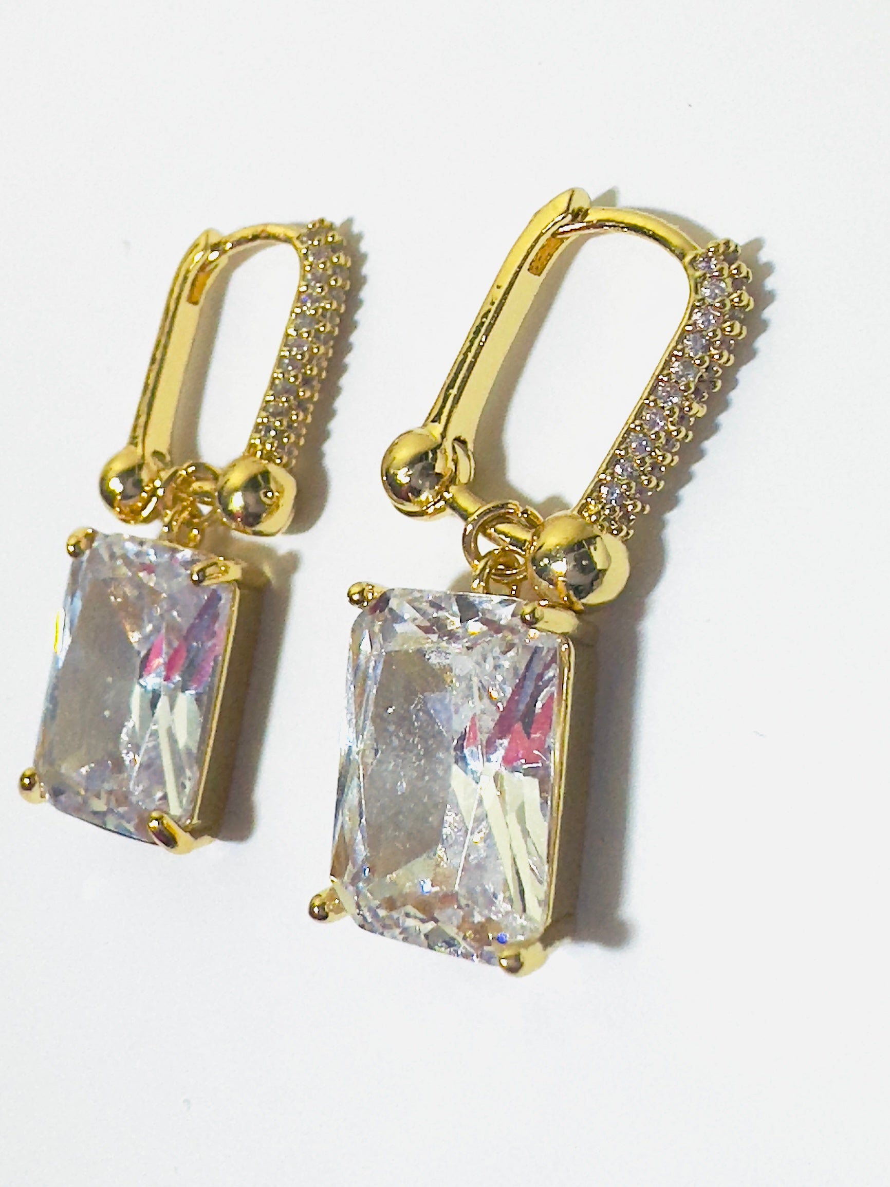 Add a touch of glam with our Crystal Luxe Drops, featuring radiant rectangular crystals suspended from gold-plated, stone studded hoops.