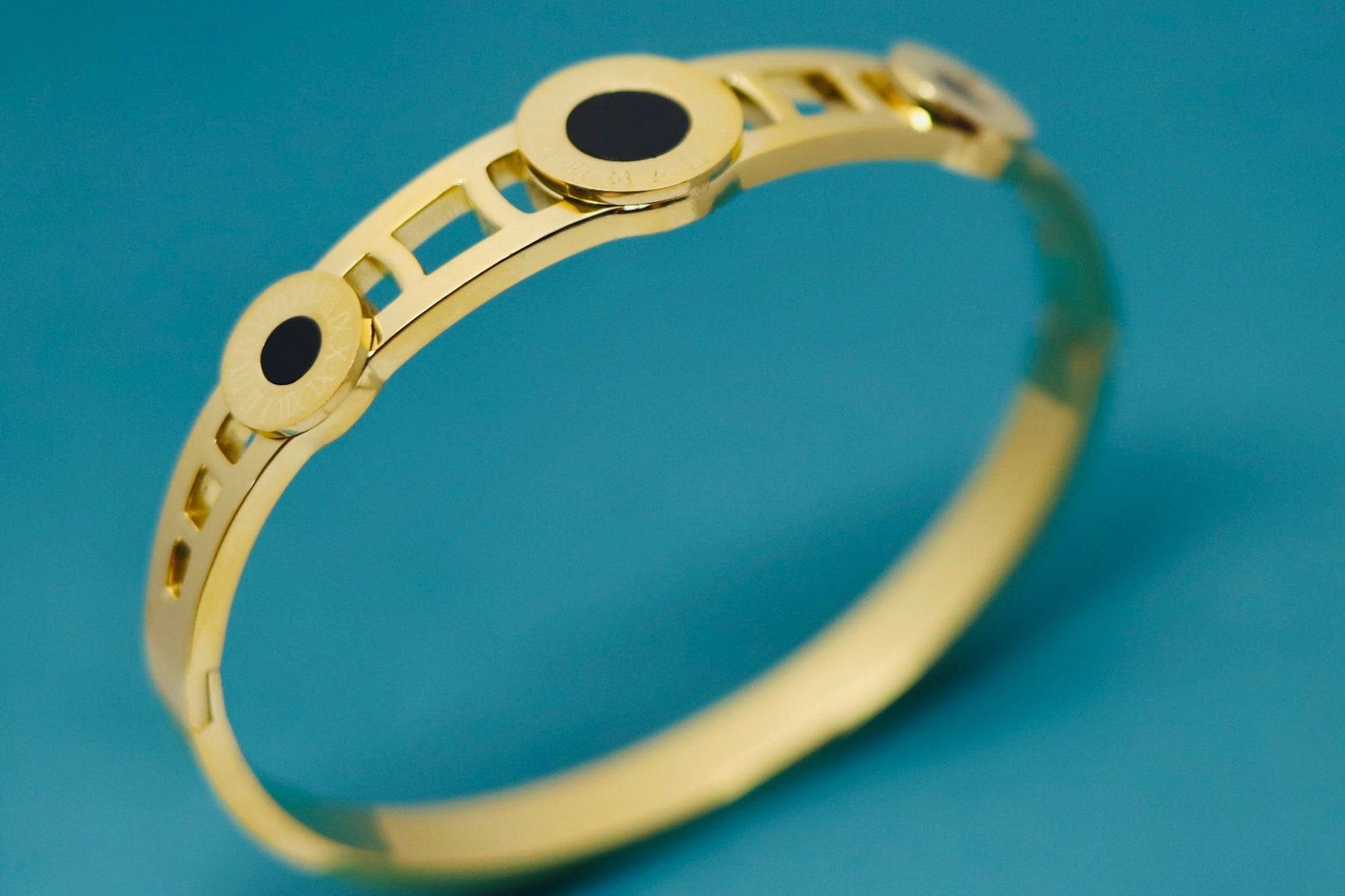 A contemporary brass bracelet designed with sleek cut-out details and round black enamel accents for a bold, modern touch. Its minimalist yet striking aesthetic makes it perfect for everyday wear and versatile styling.
