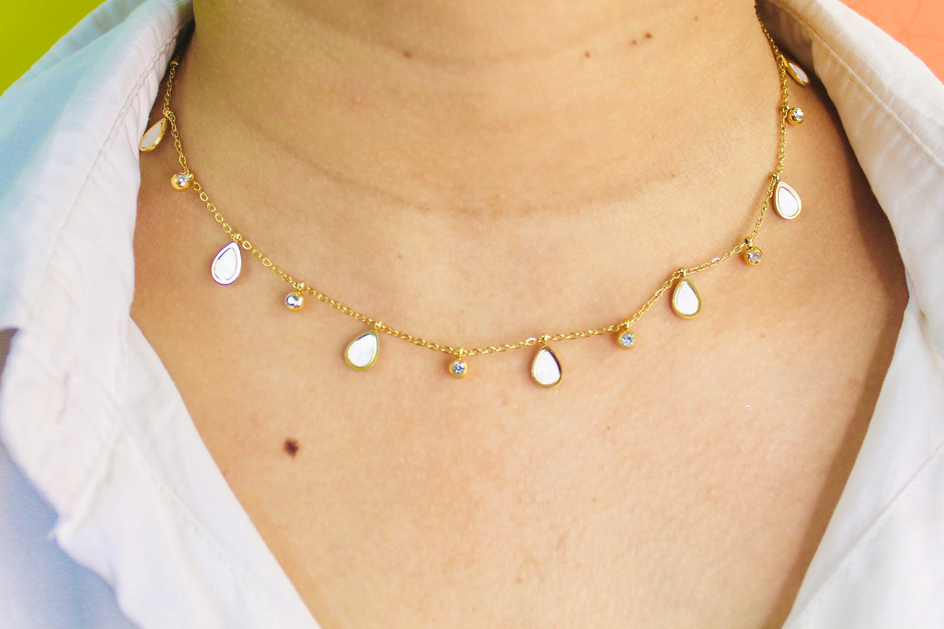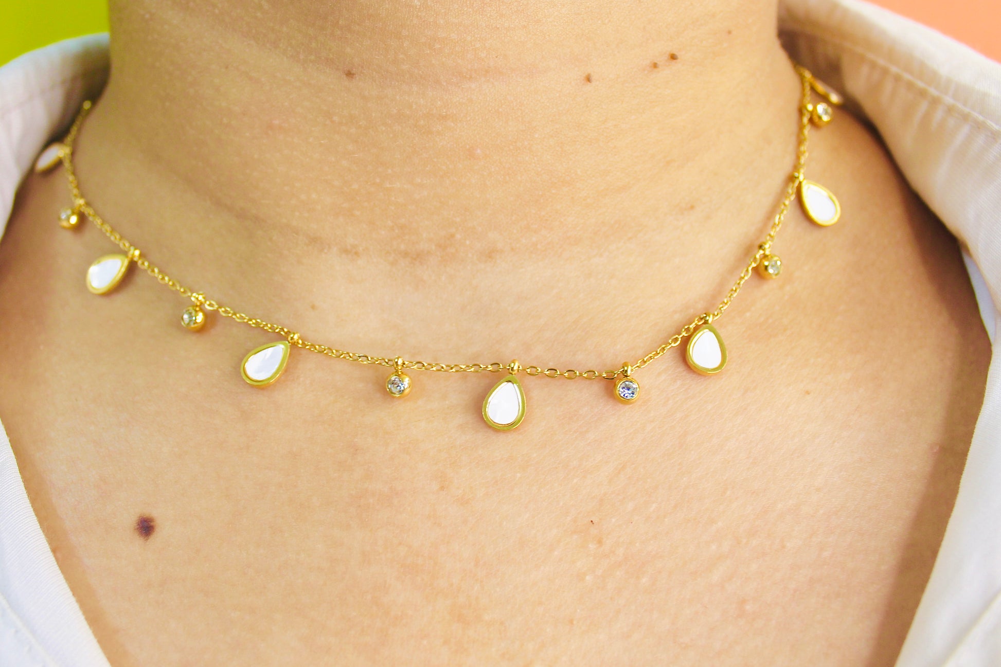 A delicate and elegant gold-plated necklace featuring alternating teardrop-shaped charms with a mother-of-pearl finish and sparkling crystal accents. Perfect for layering or wearing alone.