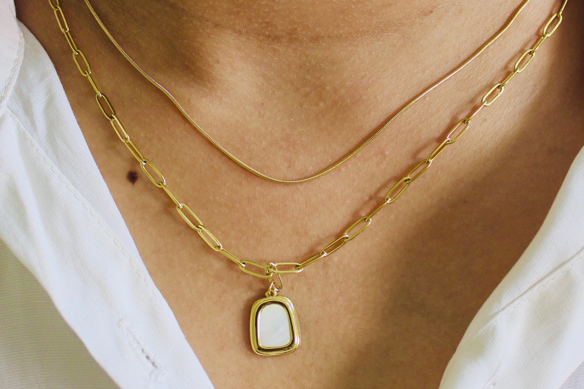 Effortlessly chic and modern, this layered necklace combines a sleek snake chain with a bold paperclip link chain, finished with a stunning geometric pendant. The elegant contrast makes it perfect for elevating casual outfits or adding polish to evening looks.