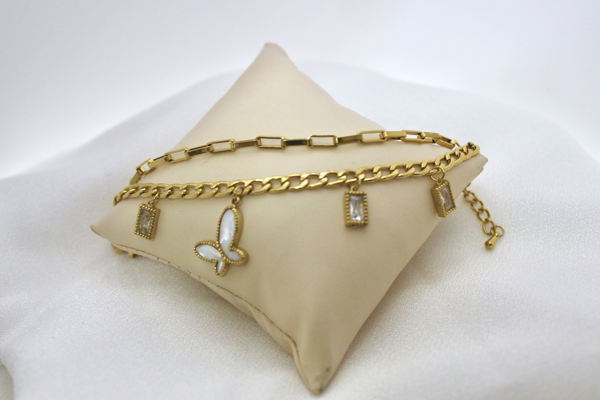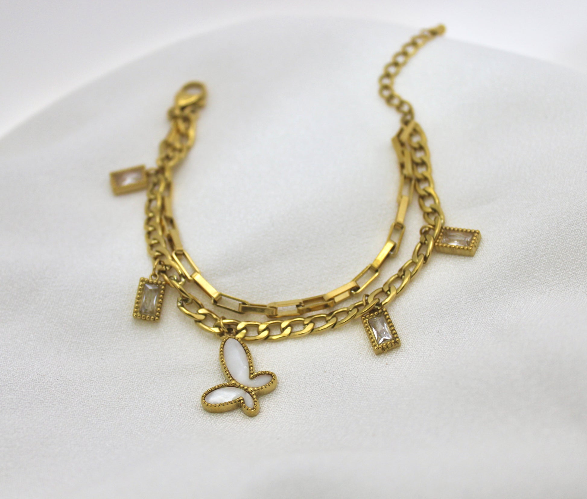 Elevate your style with this elegant gold bracelet featuring a delicate butterfly charm inlaid with pearly enamel and sparkling crystal pendants. The combination of a bold chain and a sleek rectangular link chain creates a modern layered look that’s perfect for any outfit — from casual to chic.