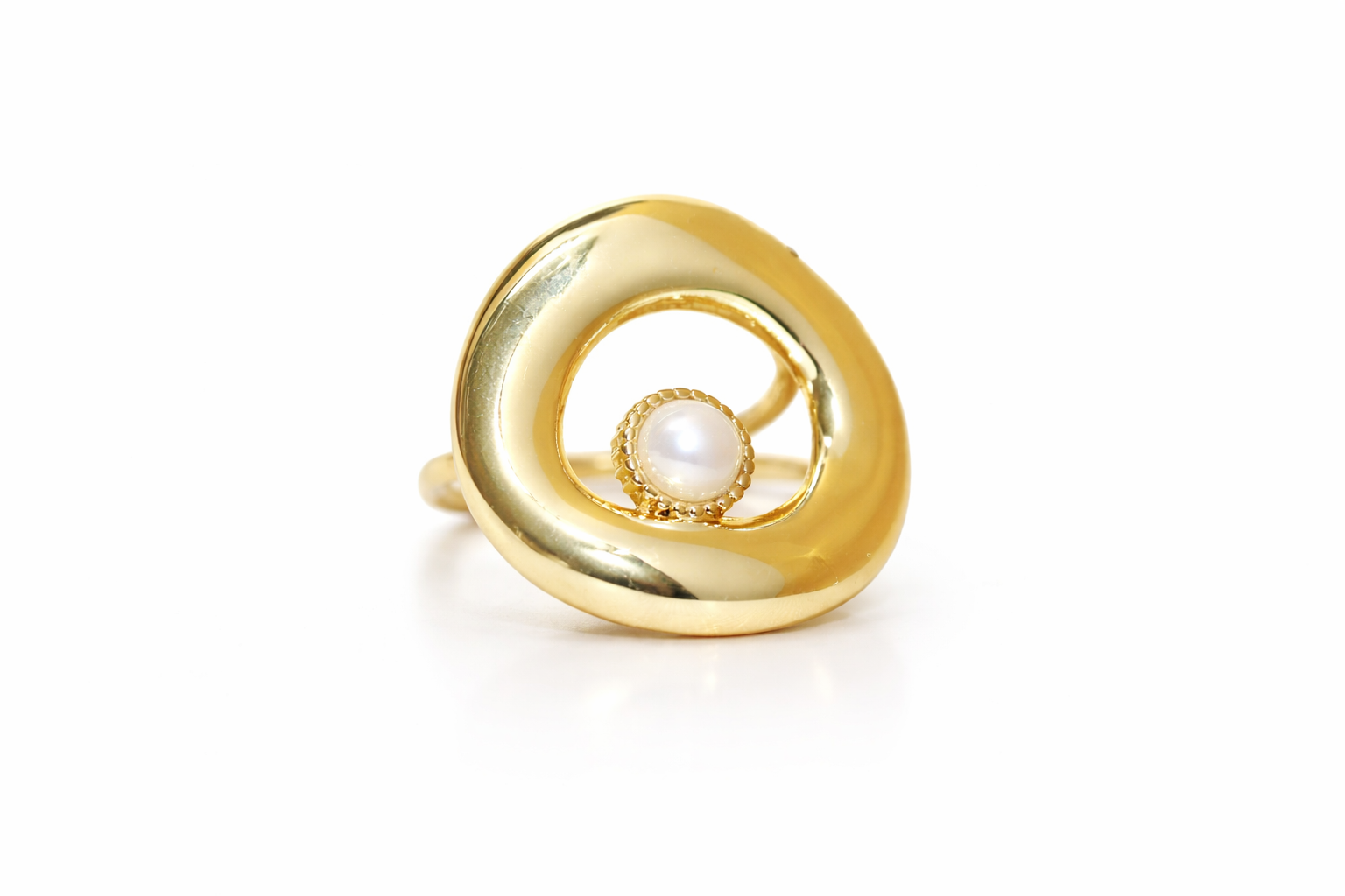 A bold yet elegant statement piece, the Golden Glow Pearl Ring features a smooth golden swirl design with a luminous pearl at the center. Perfect for both casual and dressy looks, this ring adds a touch of modern chic with timeless charm.