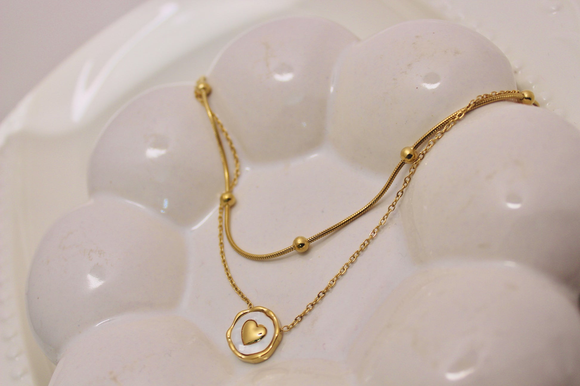 - Top layer: fine chain with heart medallion pendant