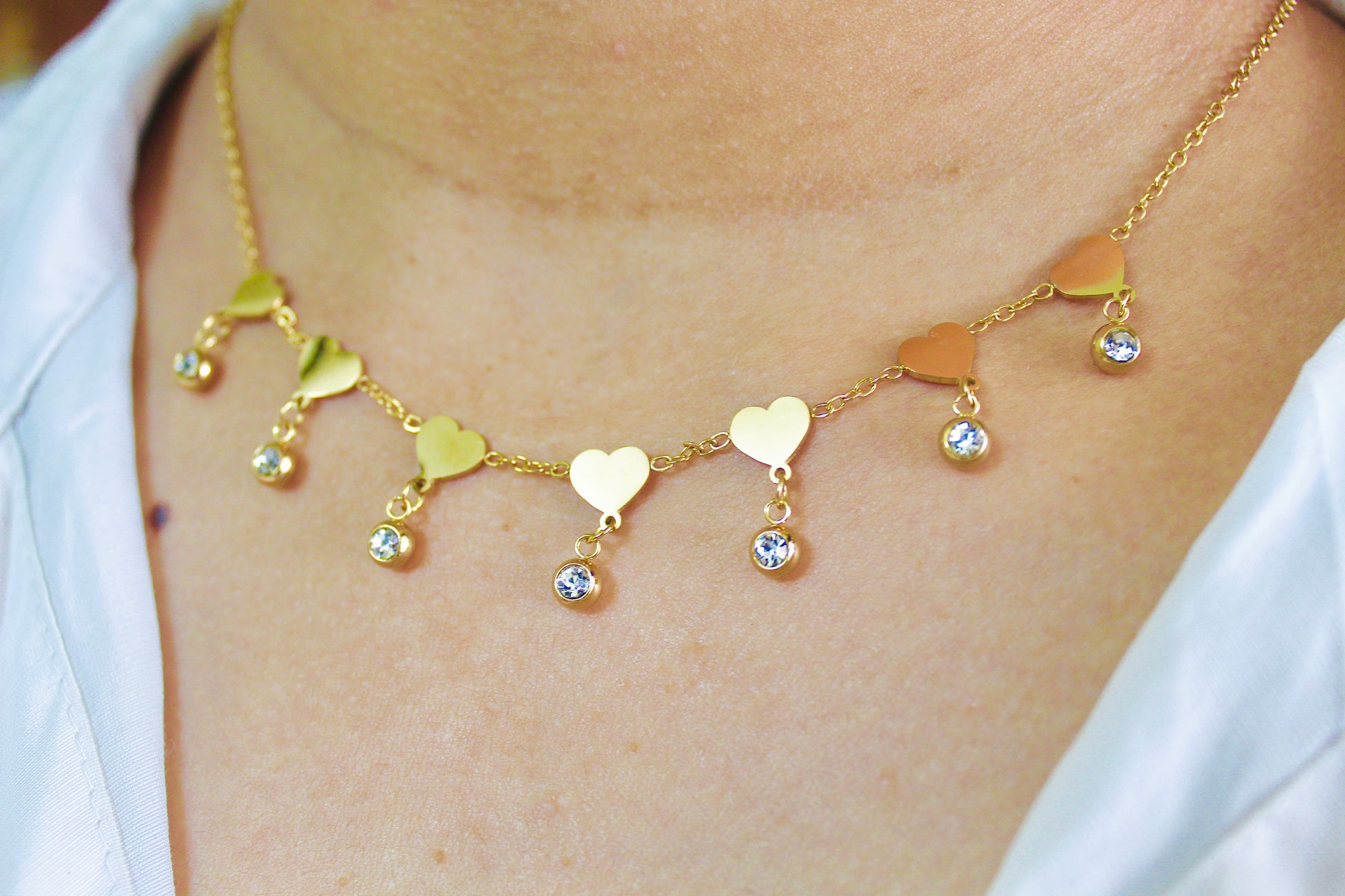 Add a touch of sweetness and sparkle to your style with the Golden Hearts Charm Necklace. This playful yet elegant piece features a row of dainty gold heart charms, each paired with a shimmering crystal drop for extra brilliance. Perfect for layering or wearing solo.