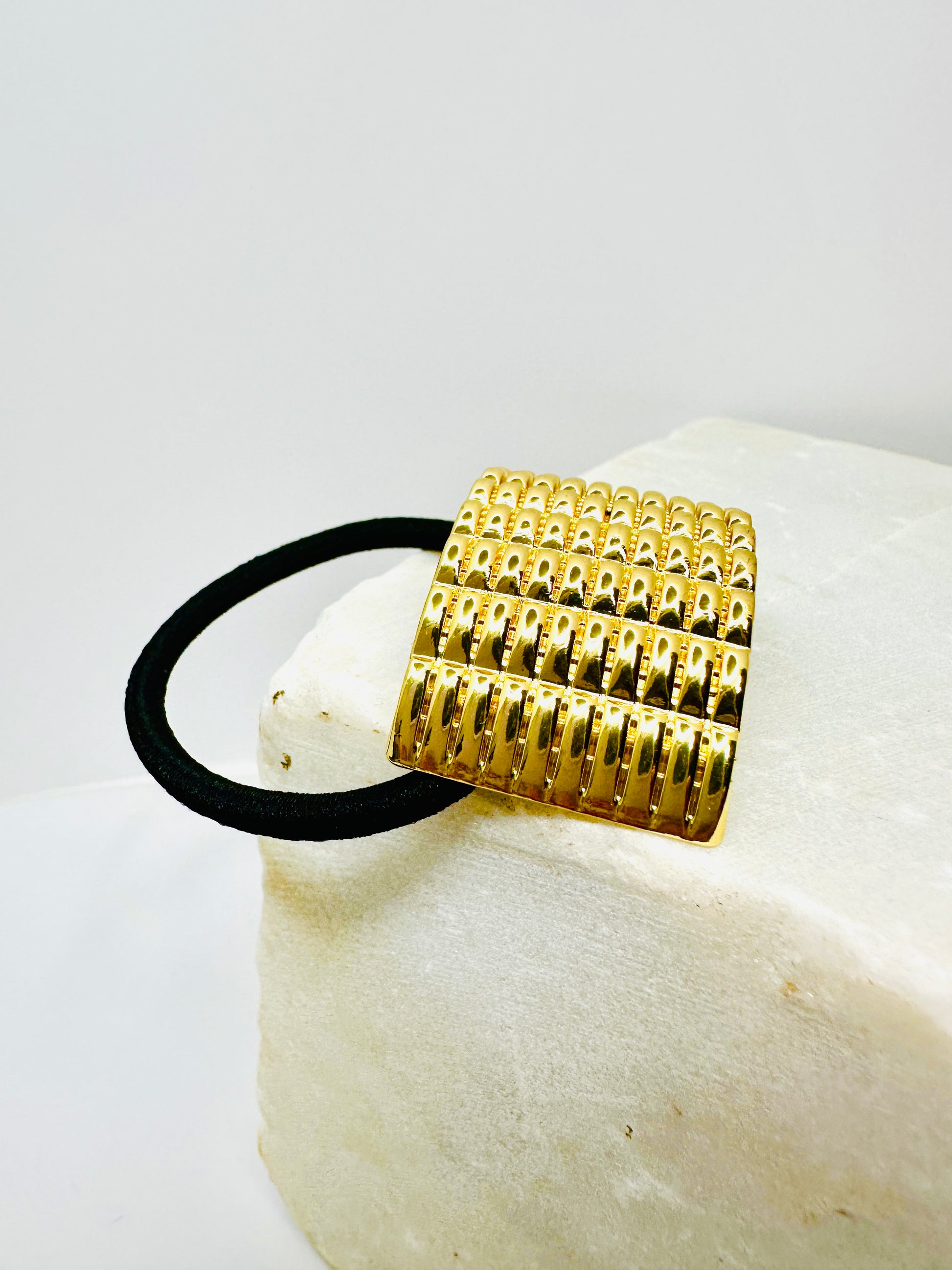 Add instant elegance to any hairstyle with this golden luxe hair cuff ponytail holder, featuring a sleek metallic finish and durable elastic band.