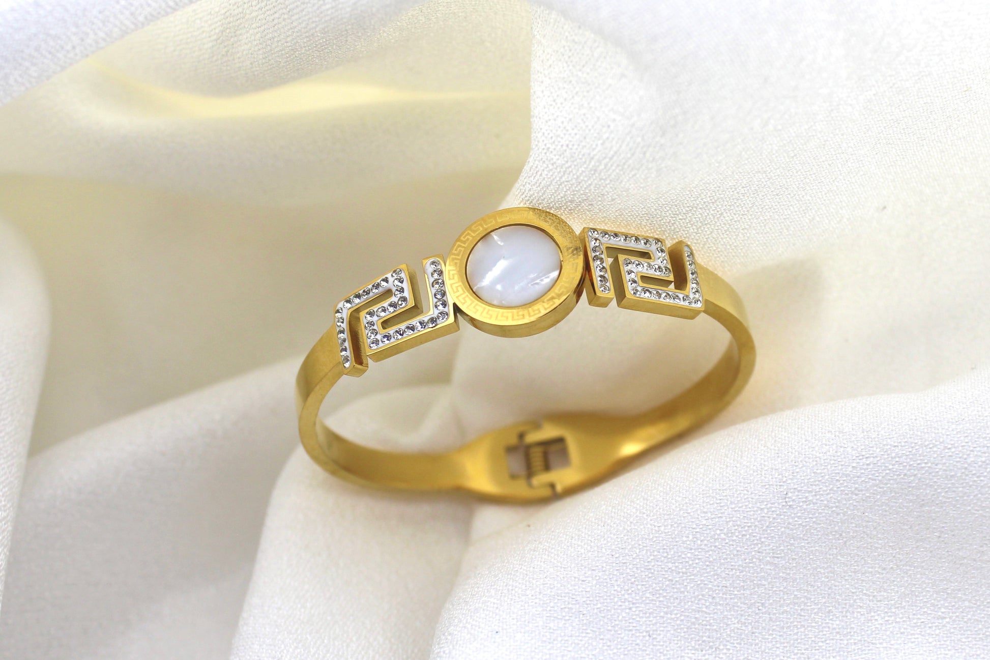 Elevate your look with this elegant gold bracelet featuring a striking Greek key design, encrusted with sparkling crystals. At its center lies a smooth round white stone, adding a touch of sophistication and balance. Perfect for special occasions or as a statement piece for daily wear, this bracelet embodies timeless beauty and modern luxury.