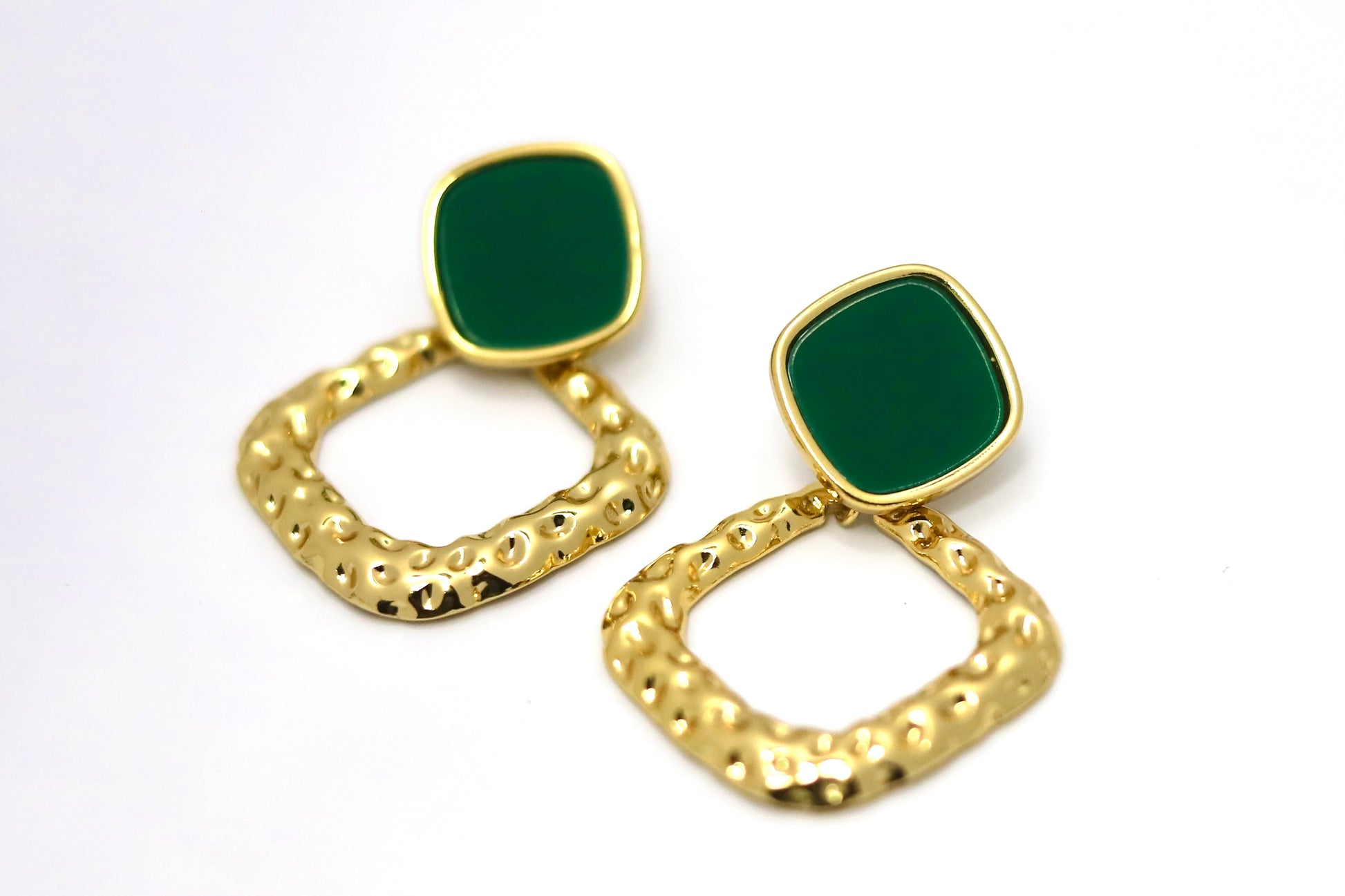 These statement earrings feature a bold square-cut green stone set in a sleek gold-plated bezel. Hanging below, a uniquely textured irregular hoop design adds a modern, artistic flair. The combination of deep emerald green and hammered gold creates a chic balance of elegance and trend, making them perfect for both festive wear and contemporary styling.