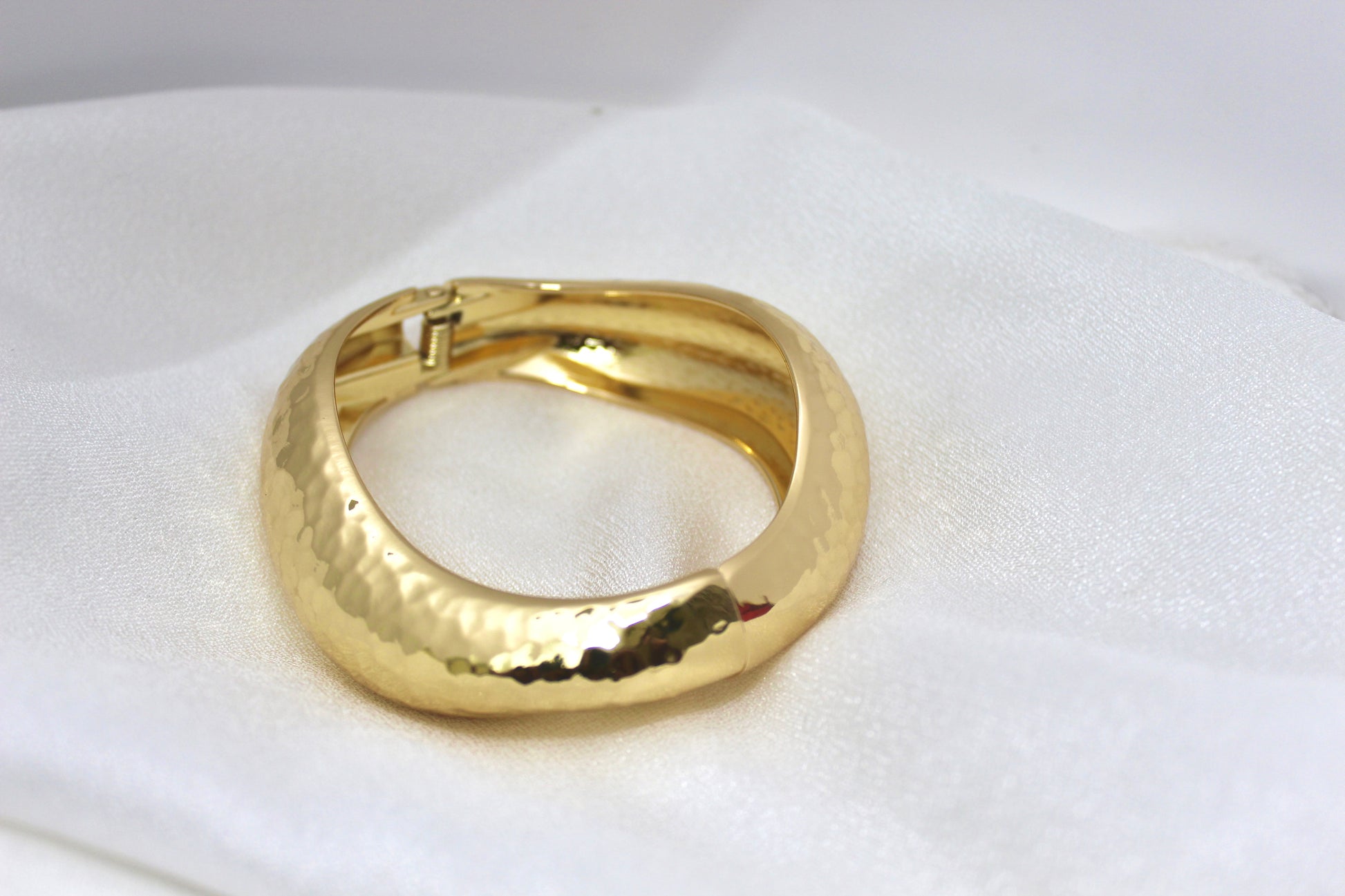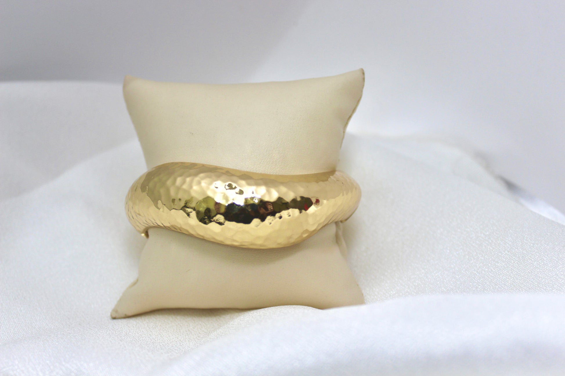 Elevate your look with this bold hammered gold bangle. Featuring a unique textured surface and a smooth, glossy interior, this piece blends classic elegance with modern edge. Its sculptural shape makes it the perfect statement accessory for both everyday wear and special occasions.