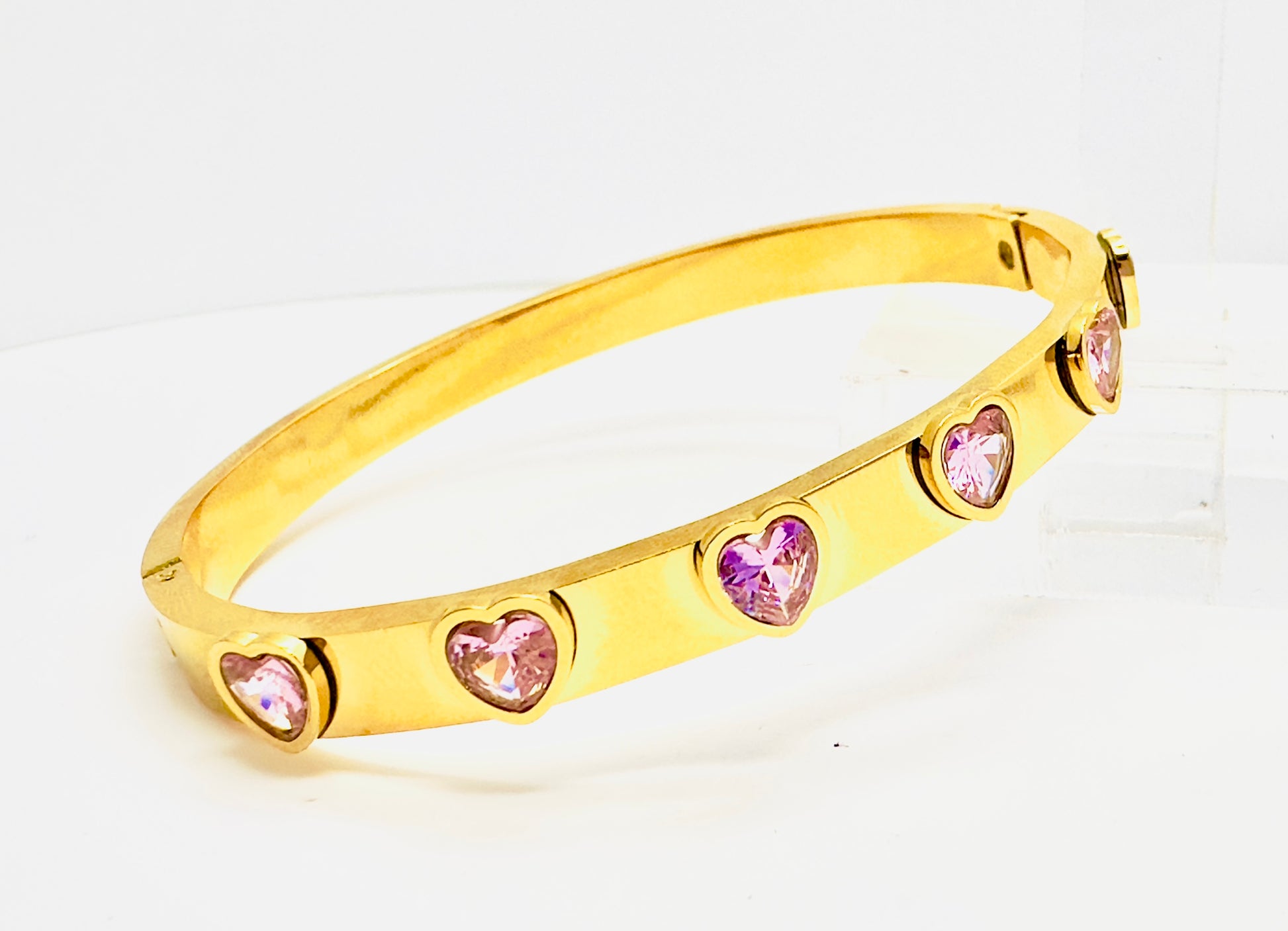 Add a touch of romance to your style with this Heart Charm Bracelet. Featuring a sleek gold-plated finish and adorned with delicate pink heart-shaped stones, this bangle exudes feminine charm and modern elegance. Perfect for stacking or wearing solo, it’s a versatile accessory for any occasion.