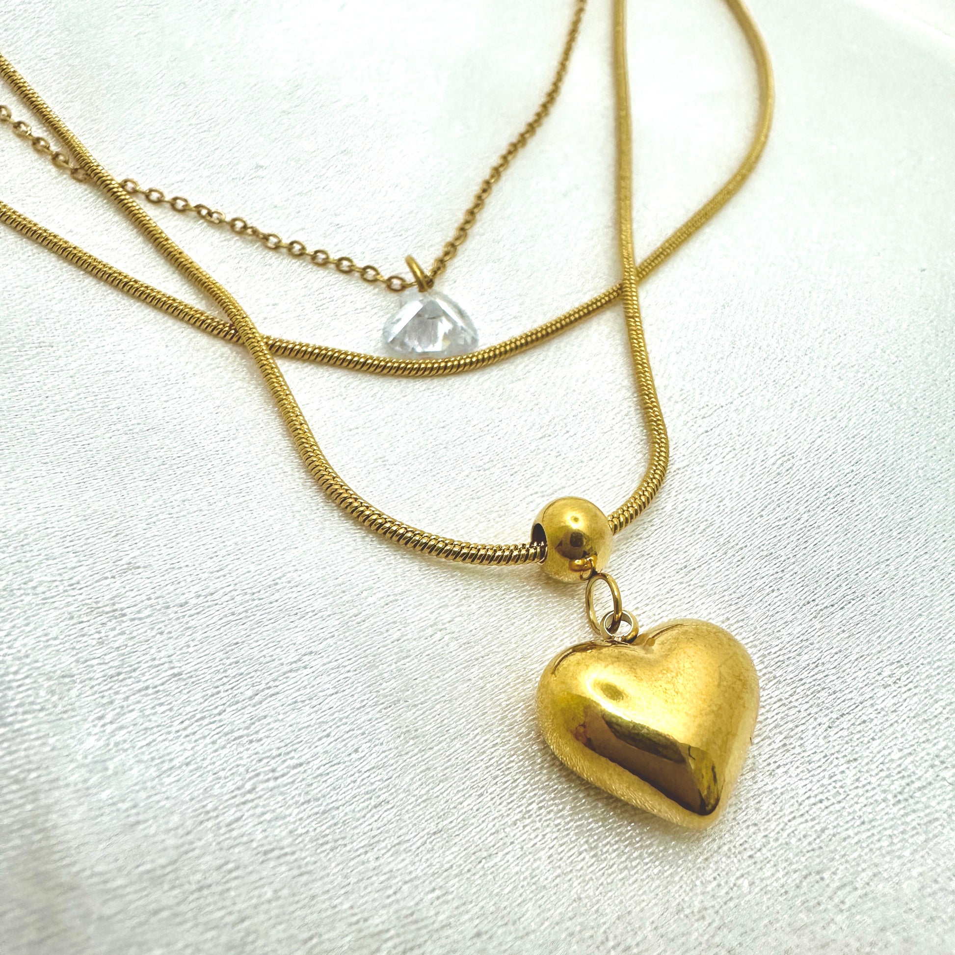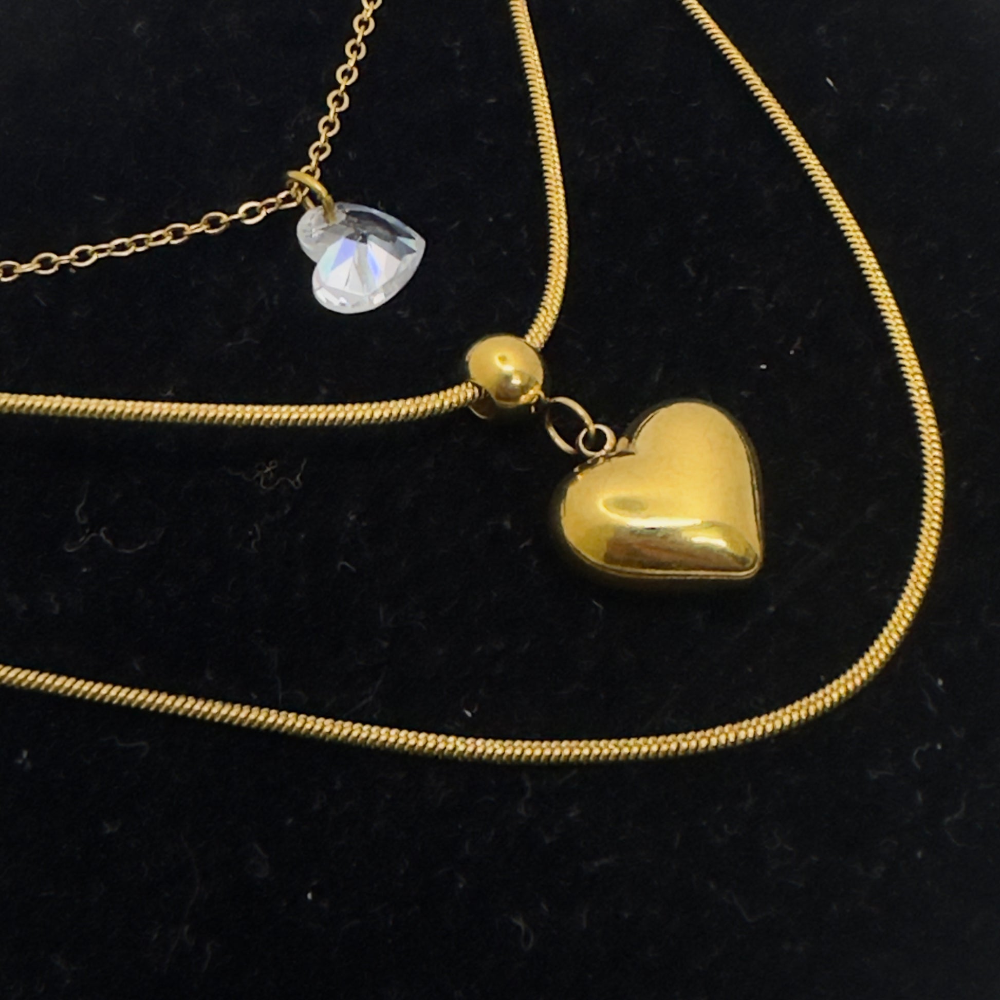 A minimal layered gold-toned necklace featuring a sparkling crystal heart on the upper chain and a polished heart pendant on the lower chain. Designed for effortless everyday styling with a modern, romantic touch. Lightweight, elegant, and perfect for both casual and dressy looks.
