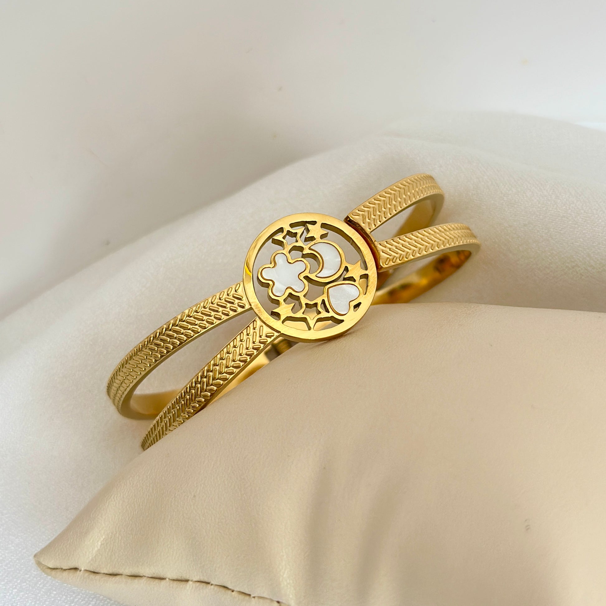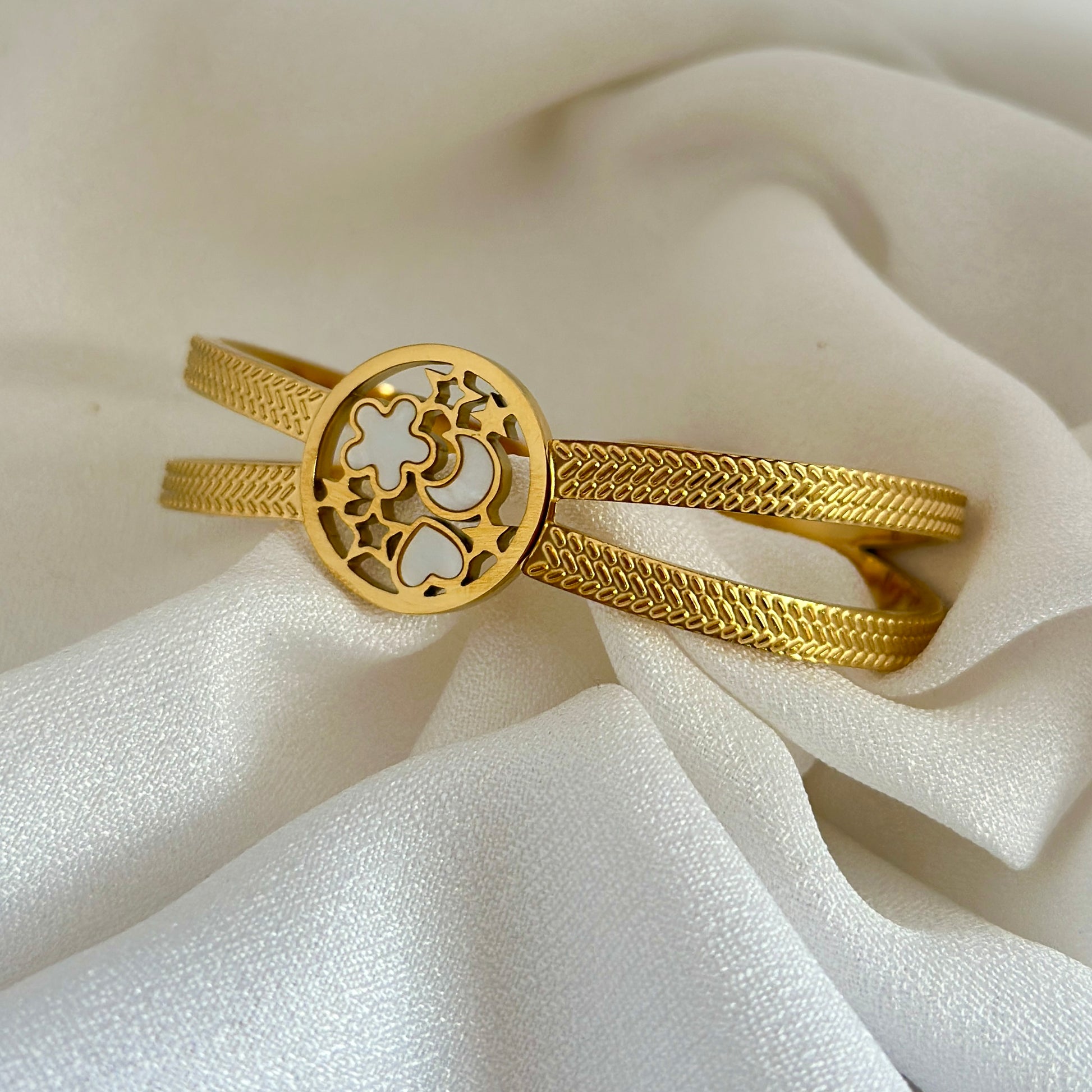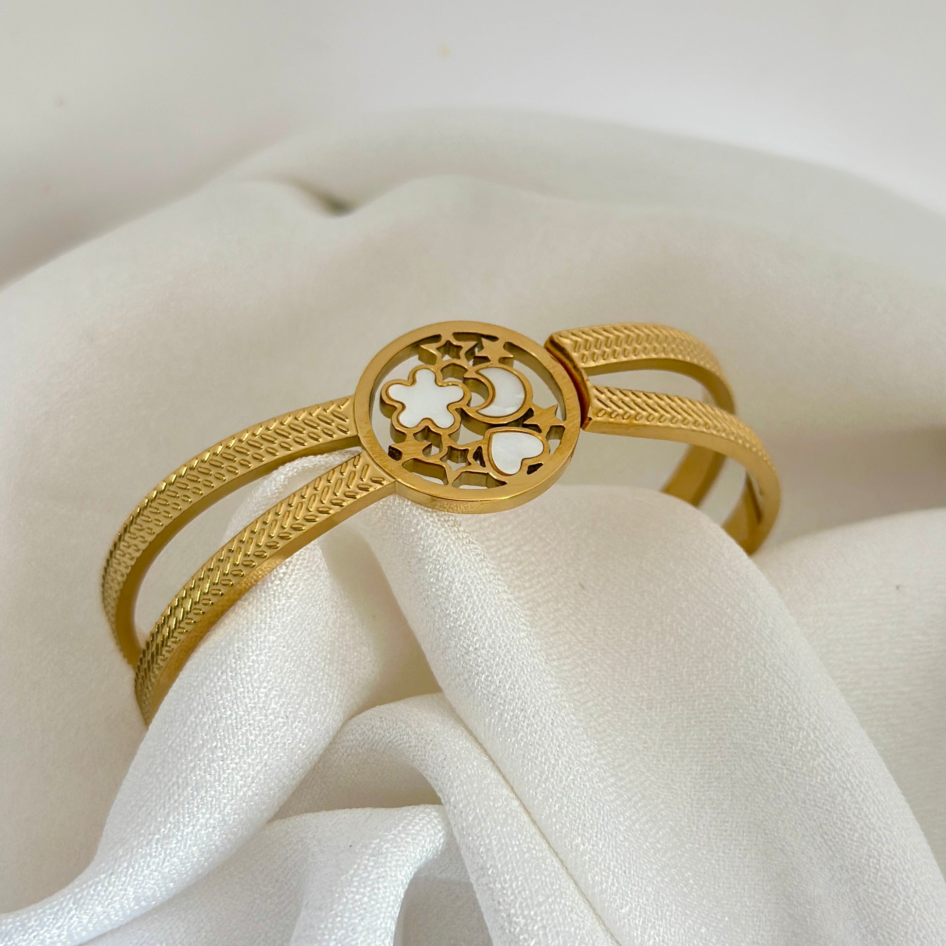 A graceful blend of texture and elegance, this gold plated kada features a beautifully crafted floral charm centerpiece with intricate detailing. Perfect for everyday sophistication and festive styling.