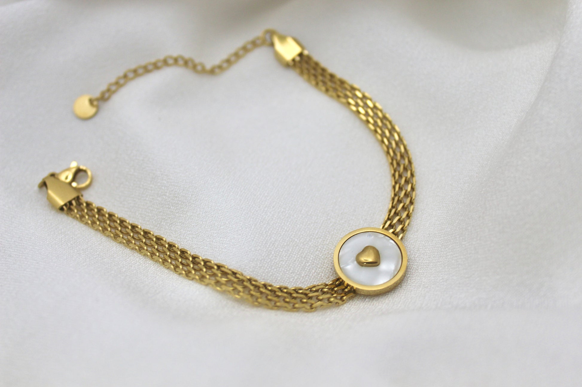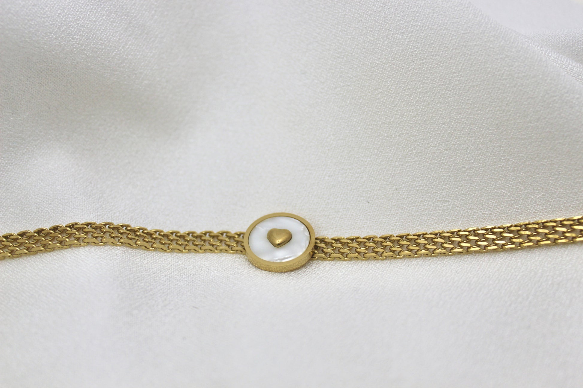 Add a touch of romance and elegance to your look with this beautiful gold bracelet. The centerpiece features a smooth white mother-of-pearl disc adorned with a delicate gold heart, creating a timeless and classy design. Perfect for everyday wear or special occasions.