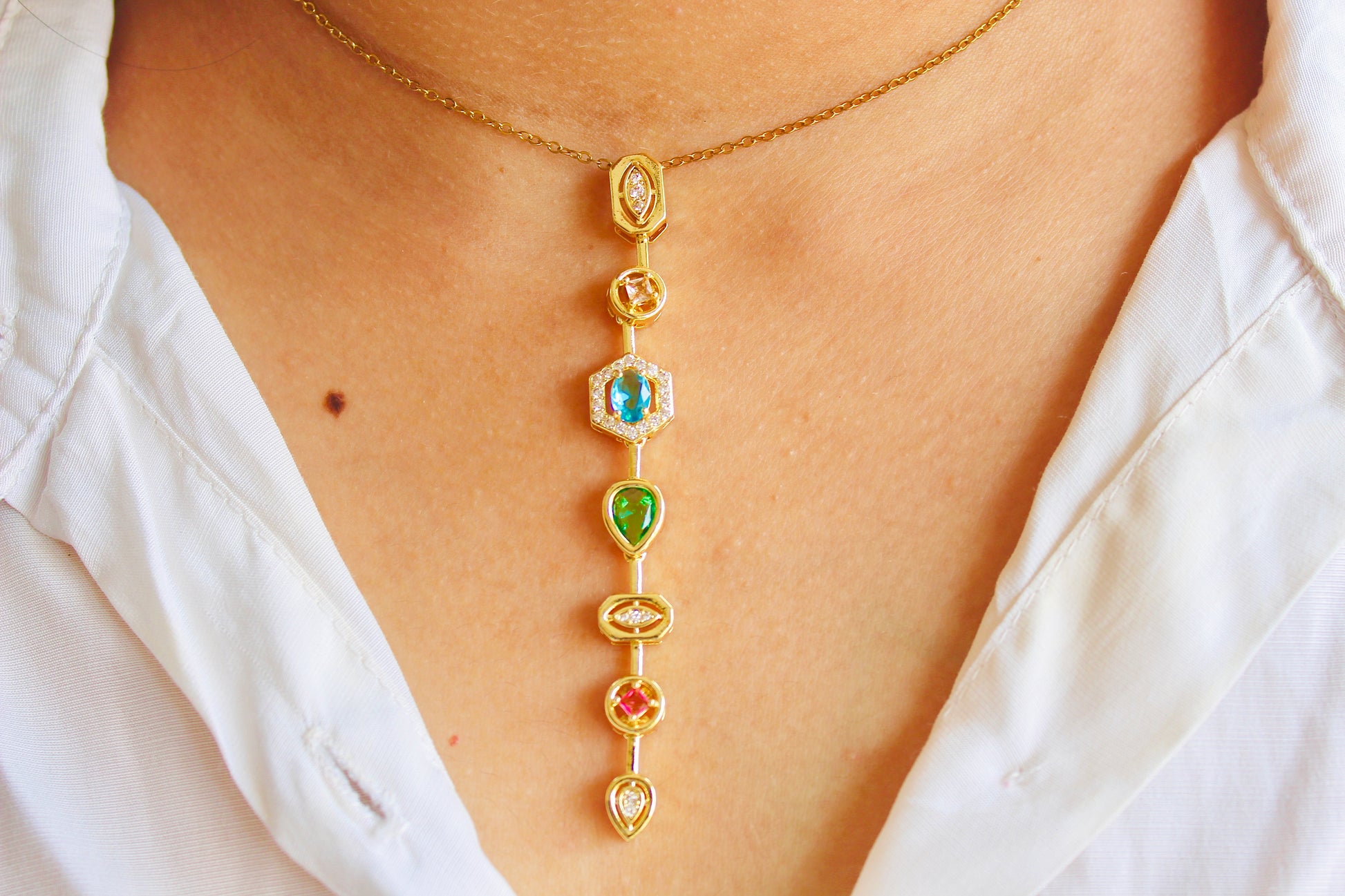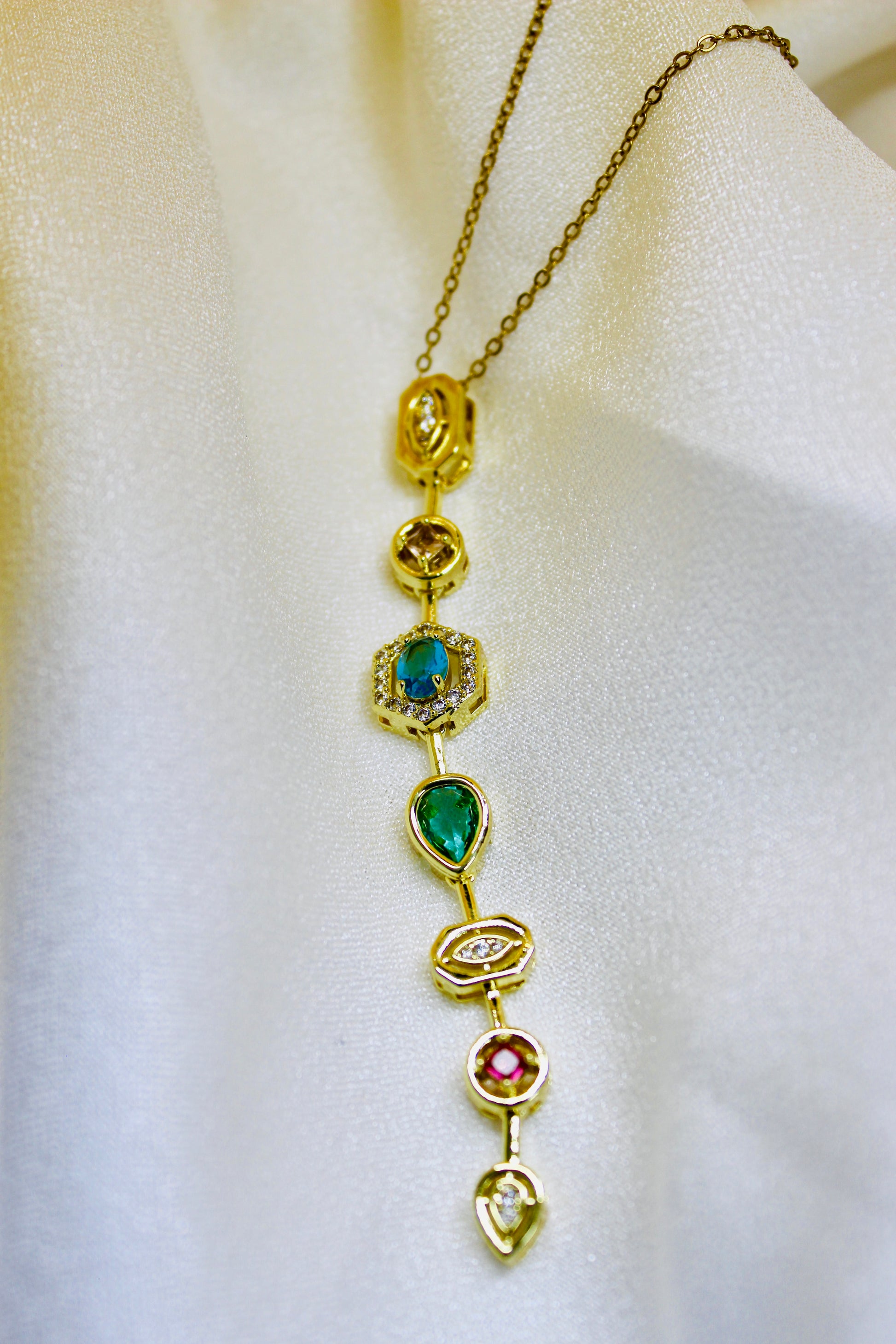 Elevate your look with this elegant gold necklace featuring a vertical drop design adorned with multicolored gemstones. Each stone is uniquely cut and set in gold frames, creating a vibrant yet sophisticated style. Perfect for both formal occasions and everyday wear, this statement piece adds a touch of luxury and personality to your outfit.
