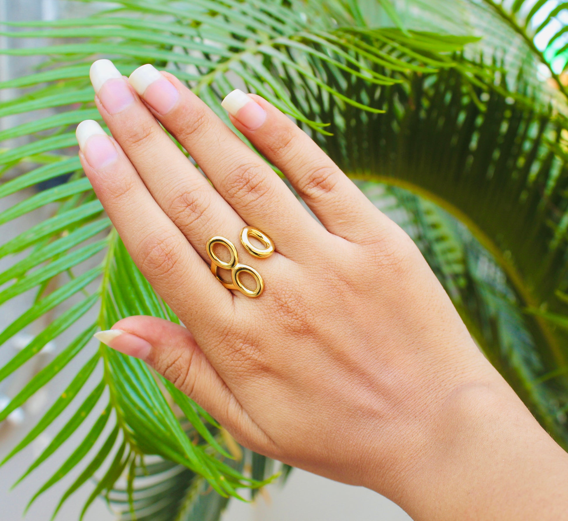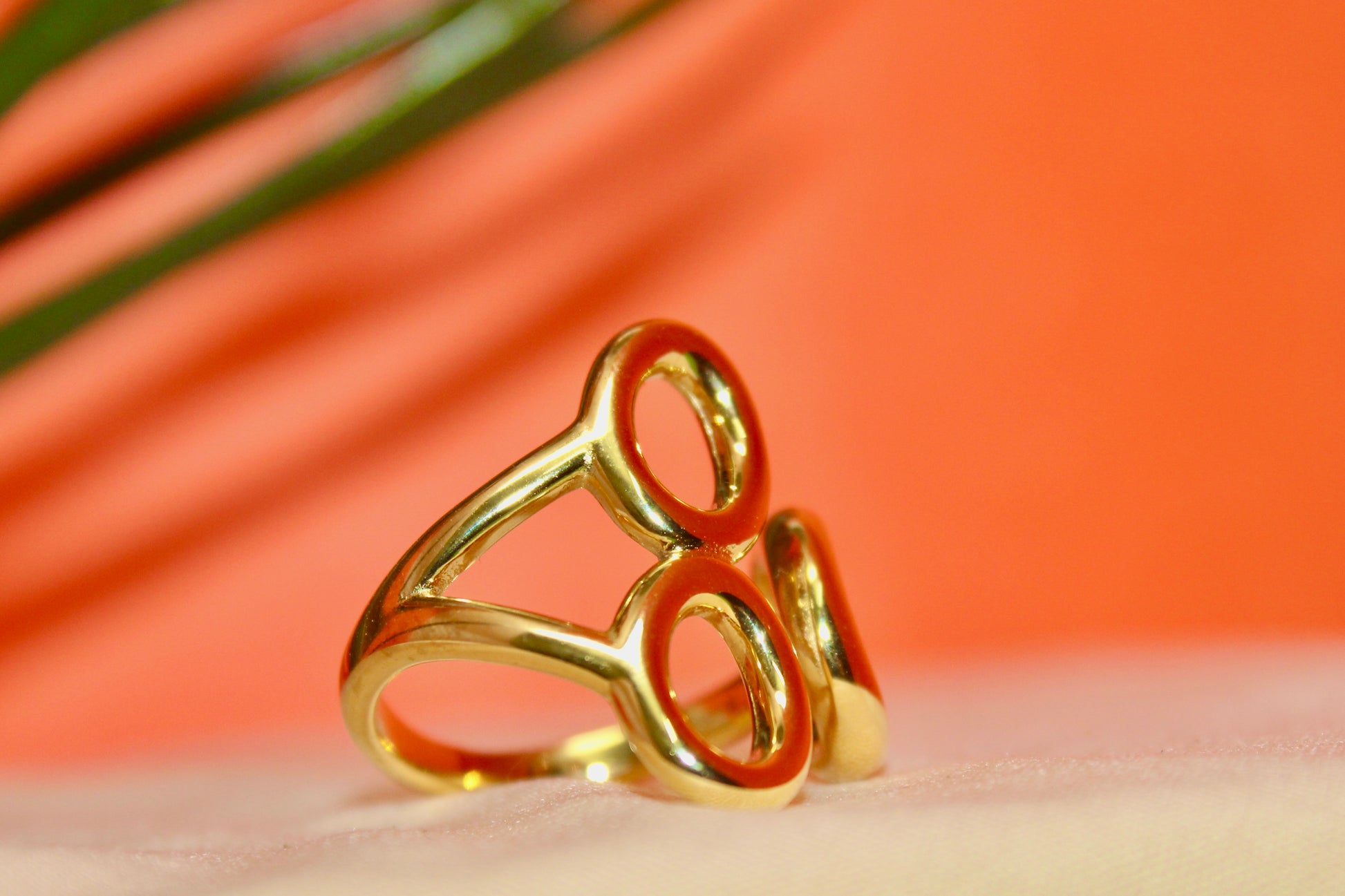 A bold and modern gold-tone statement ring with sleek open oval loops. Minimal yet trendy, designed for effortless everyday wear and standout style.
