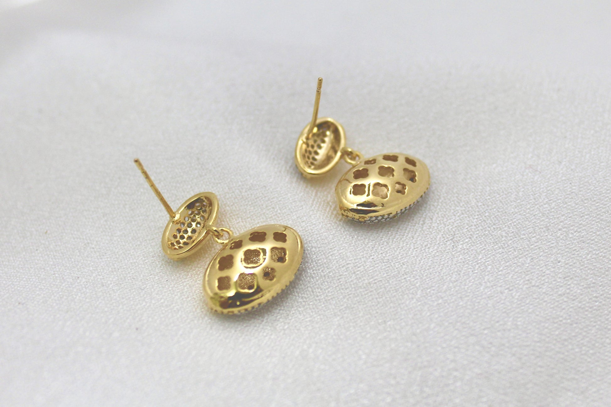 Crafted with a polished gold-tone finish and encrusted with shimmering stones, these earrings strike the perfect balance between elegance and glamour. The unique oval shape adds a refined touch, making them ideal for both everyday elegance and special occasions.