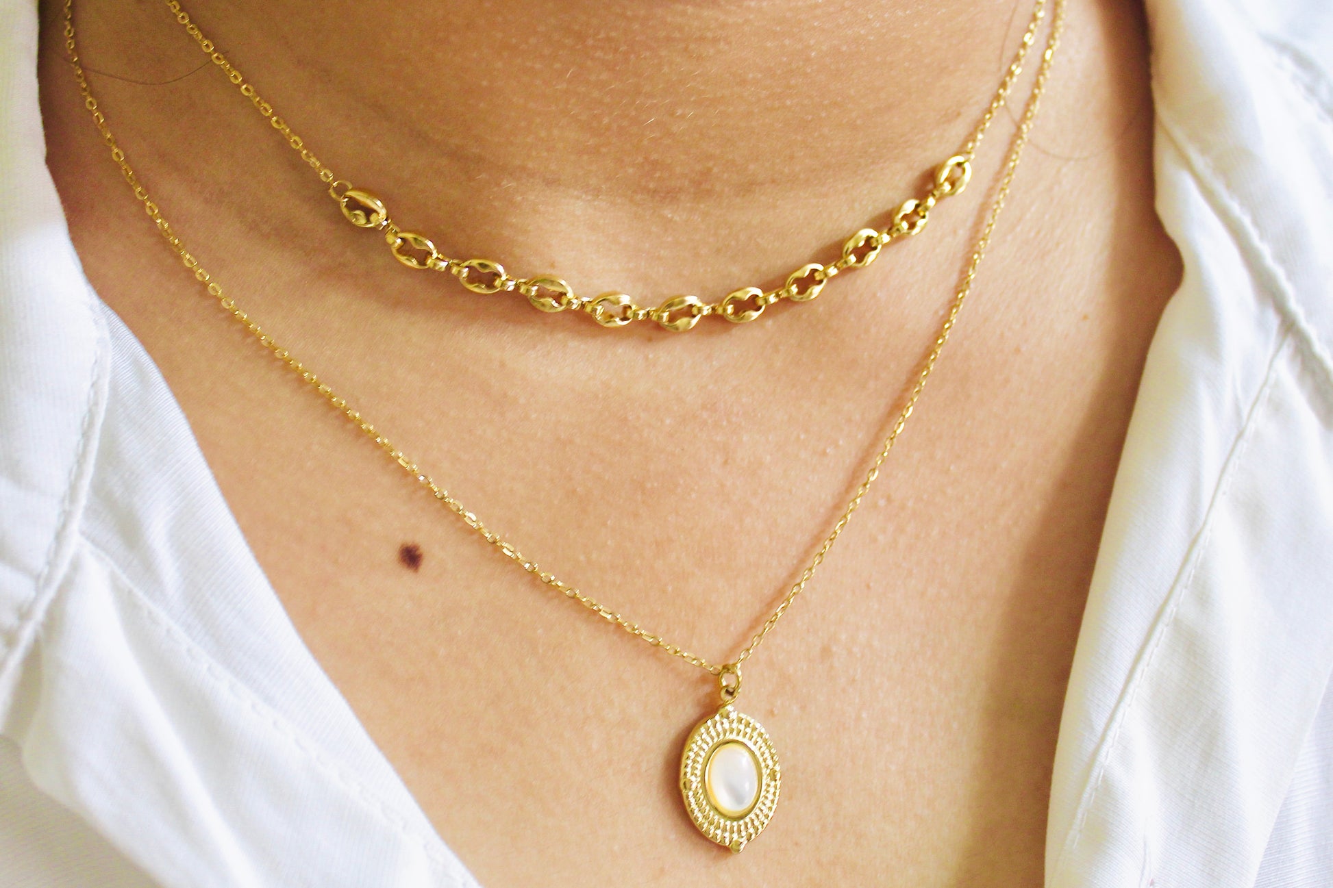 - Bottom layer: fine chain with a pearl-accented pendant