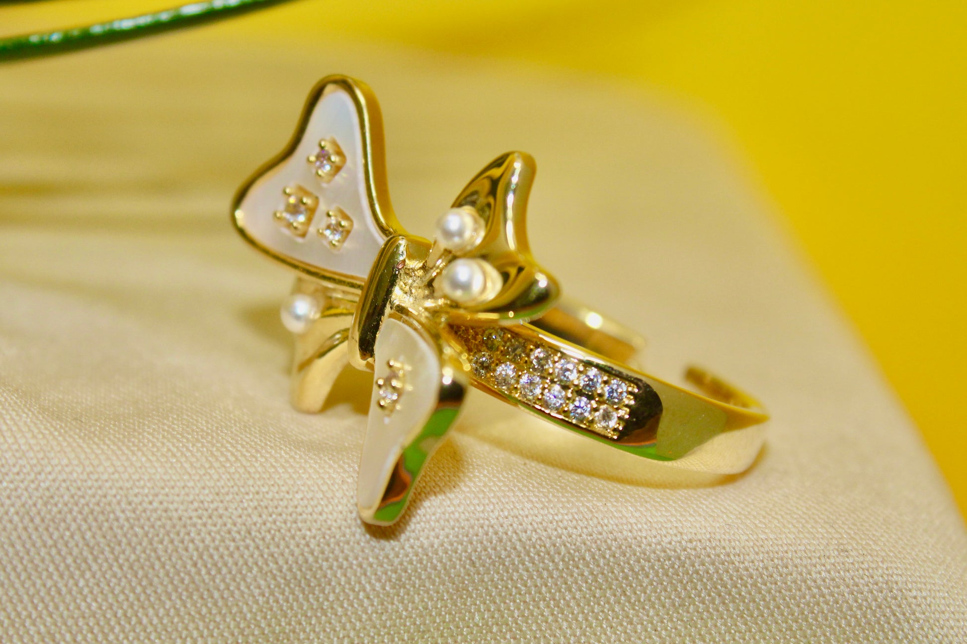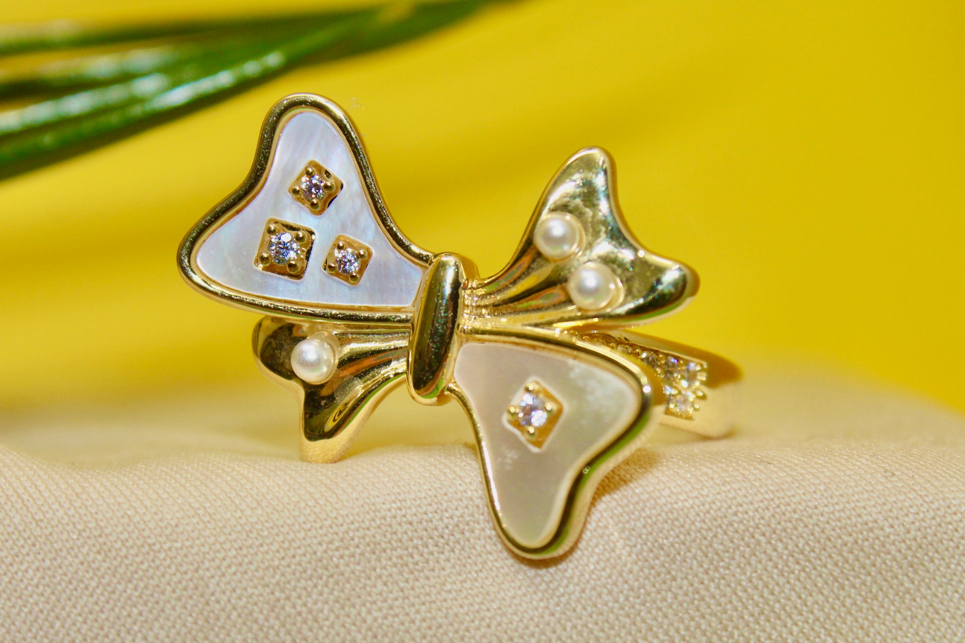 A charming bow-shaped ring detailed with shimmering pearls and sparkling stones on a polished gold-tone base. Feminine, elegant, and perfect for adding a playful touch to your look.