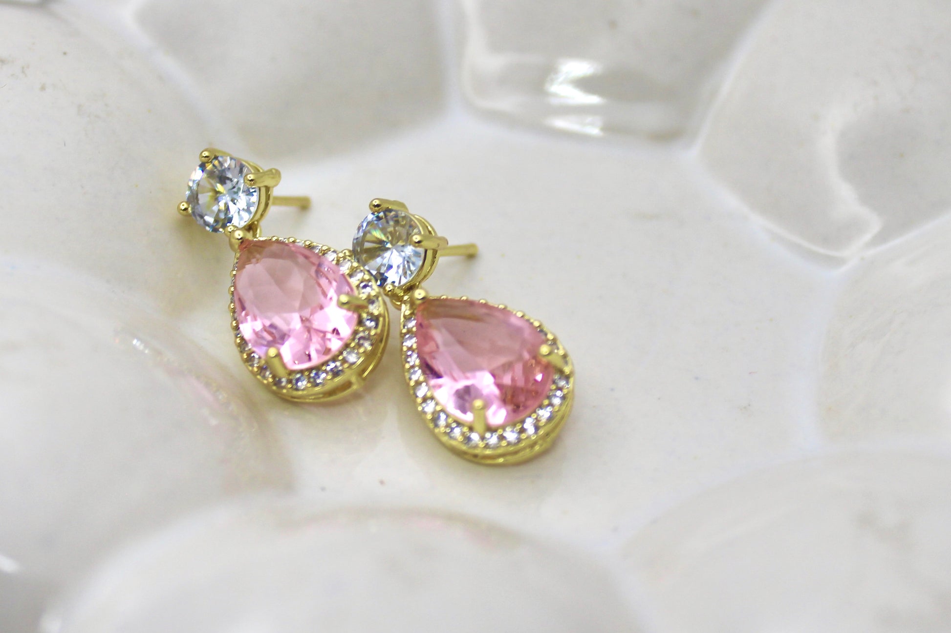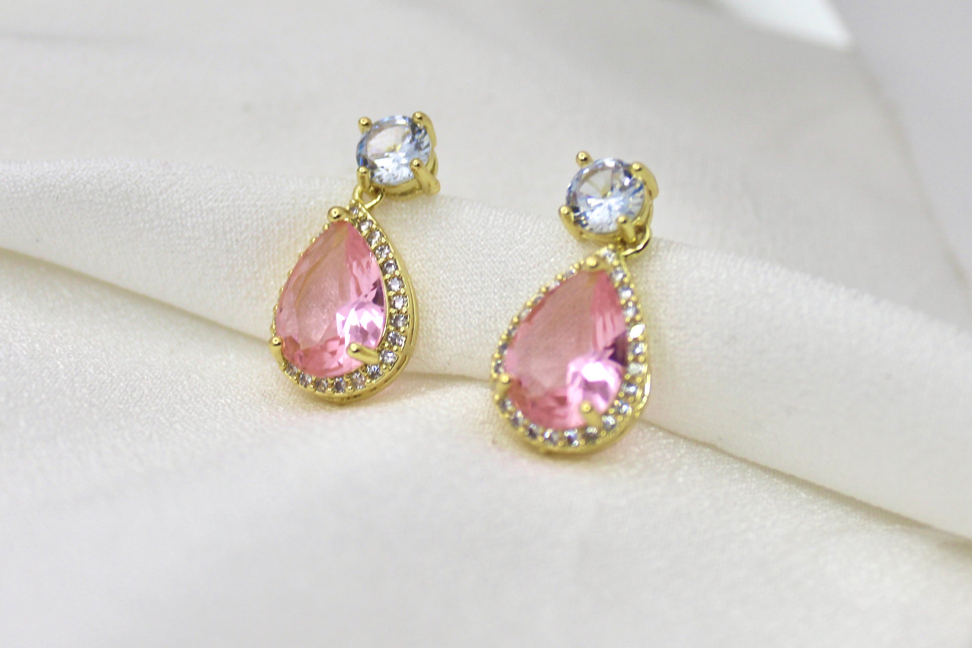 The dazzling clear stud is beautifully paired with a pink teardrop crystal, framed by delicate micro stones for extra brilliance. Perfect for weddings, festive occasions, or elevating your evening style with timeless charm.