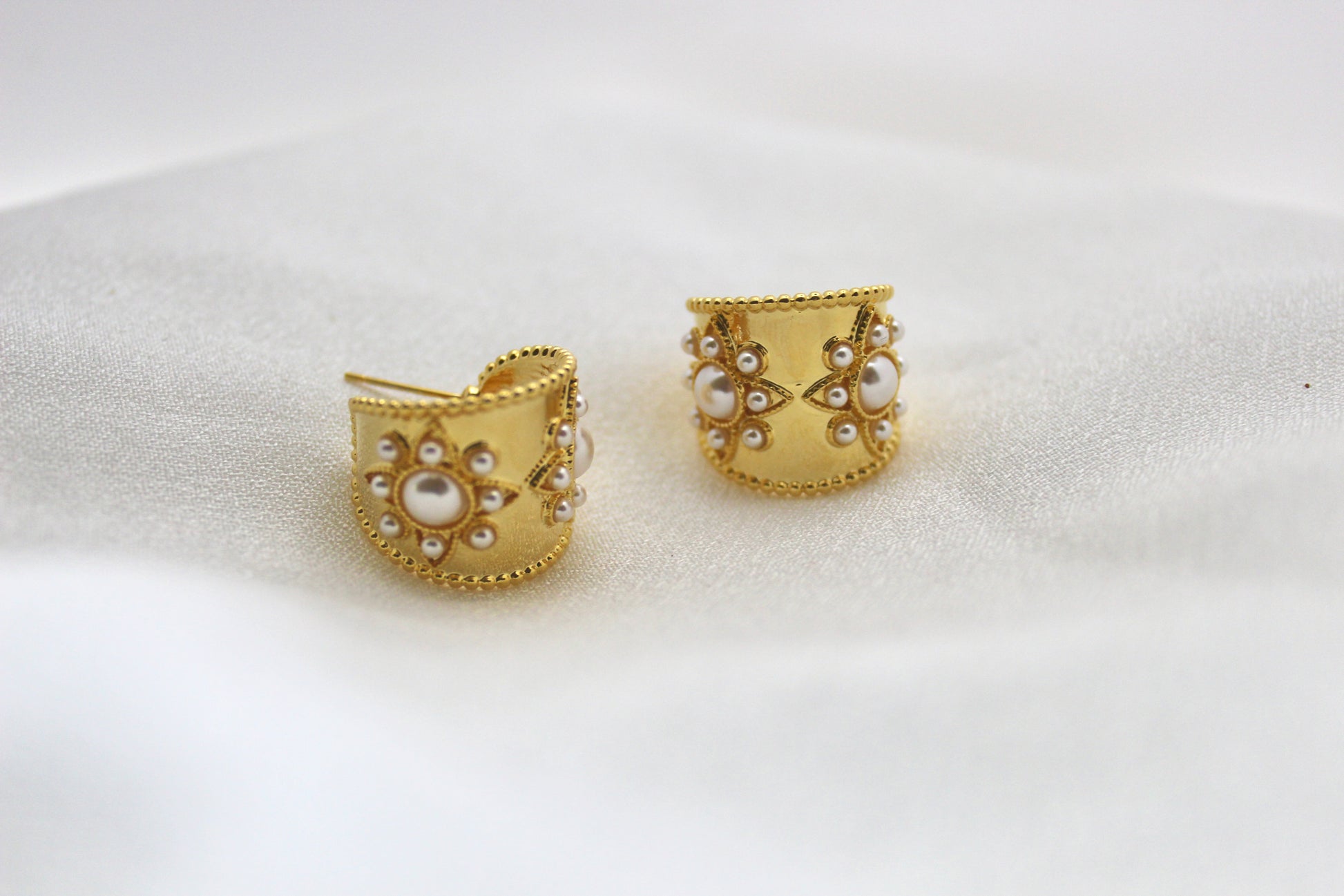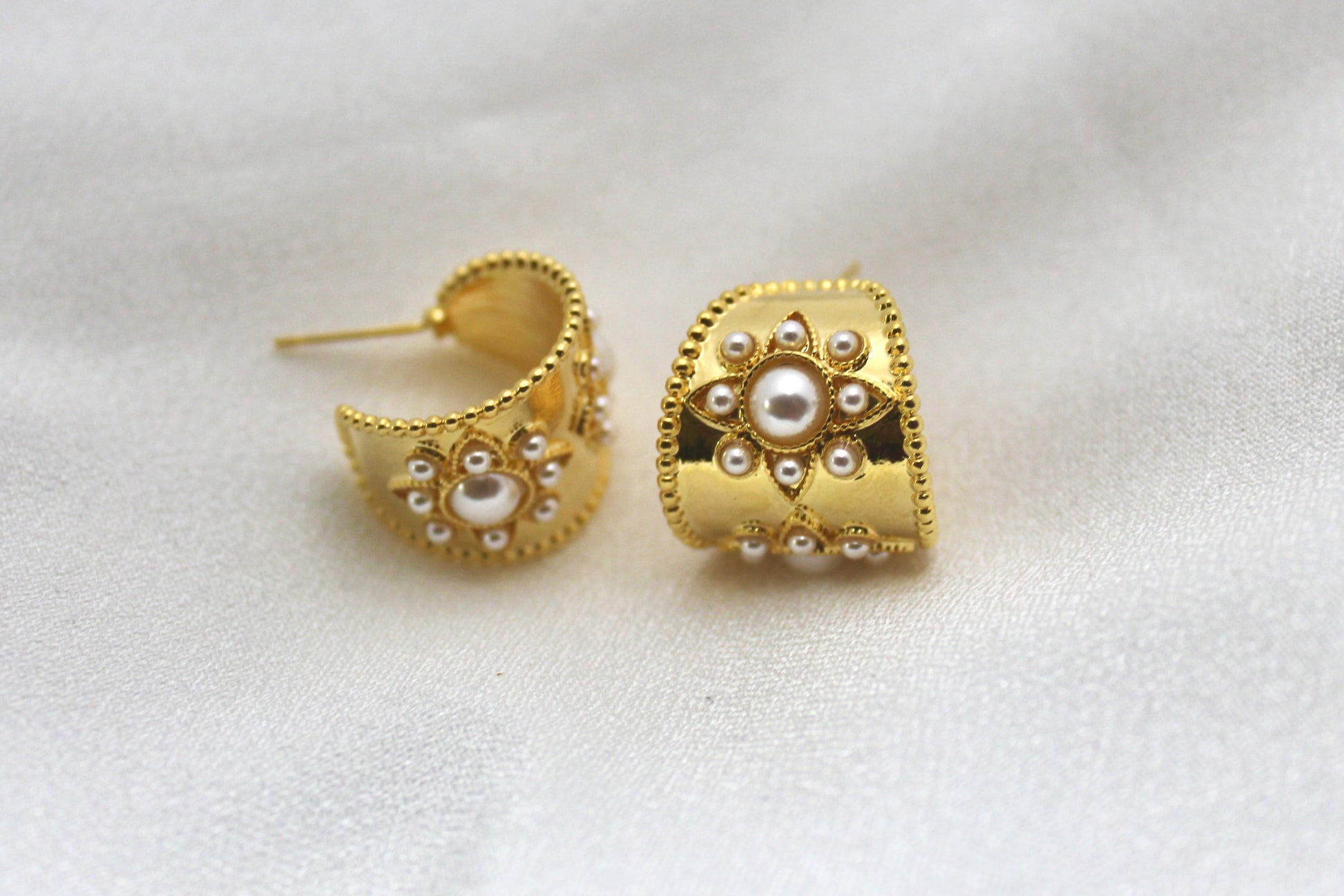 Channel timeless elegance with our Regal Pearl Statement Hoops. Adorned with delicate pearl accents and intricate gold detailing, these earrings bring a royal touch to any look. Their bold, structured design makes them perfect for festive occasions, weddings, or elevating a simple outfit with a touch of grandeur.