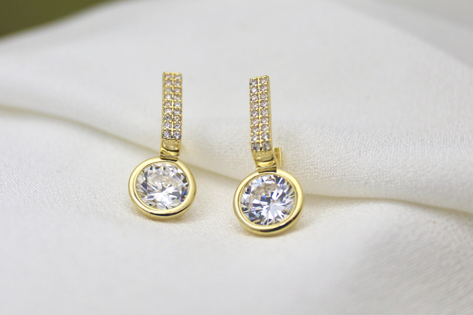 Featuring a brilliant-cut stone in a sleek gold bezel setting, paired with a shimmering pavé-accented hook, this pair is designed to catch every glimmer of light. Perfect for weddings, parties, or elevating your everyday outfits with effortless sophistication.