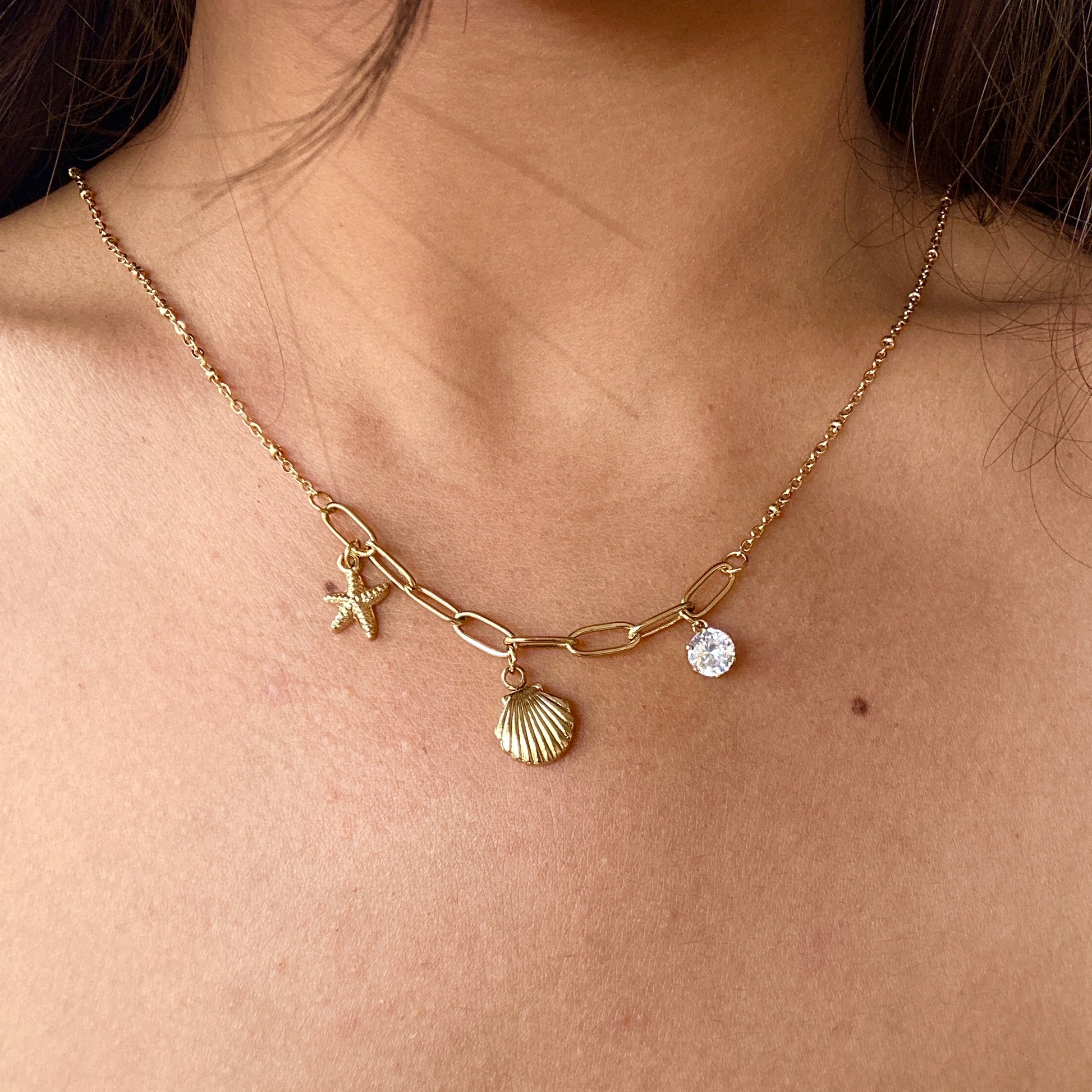 - Design: Asymmetrical Chain with Starfish, Shell & Crystal Charms
