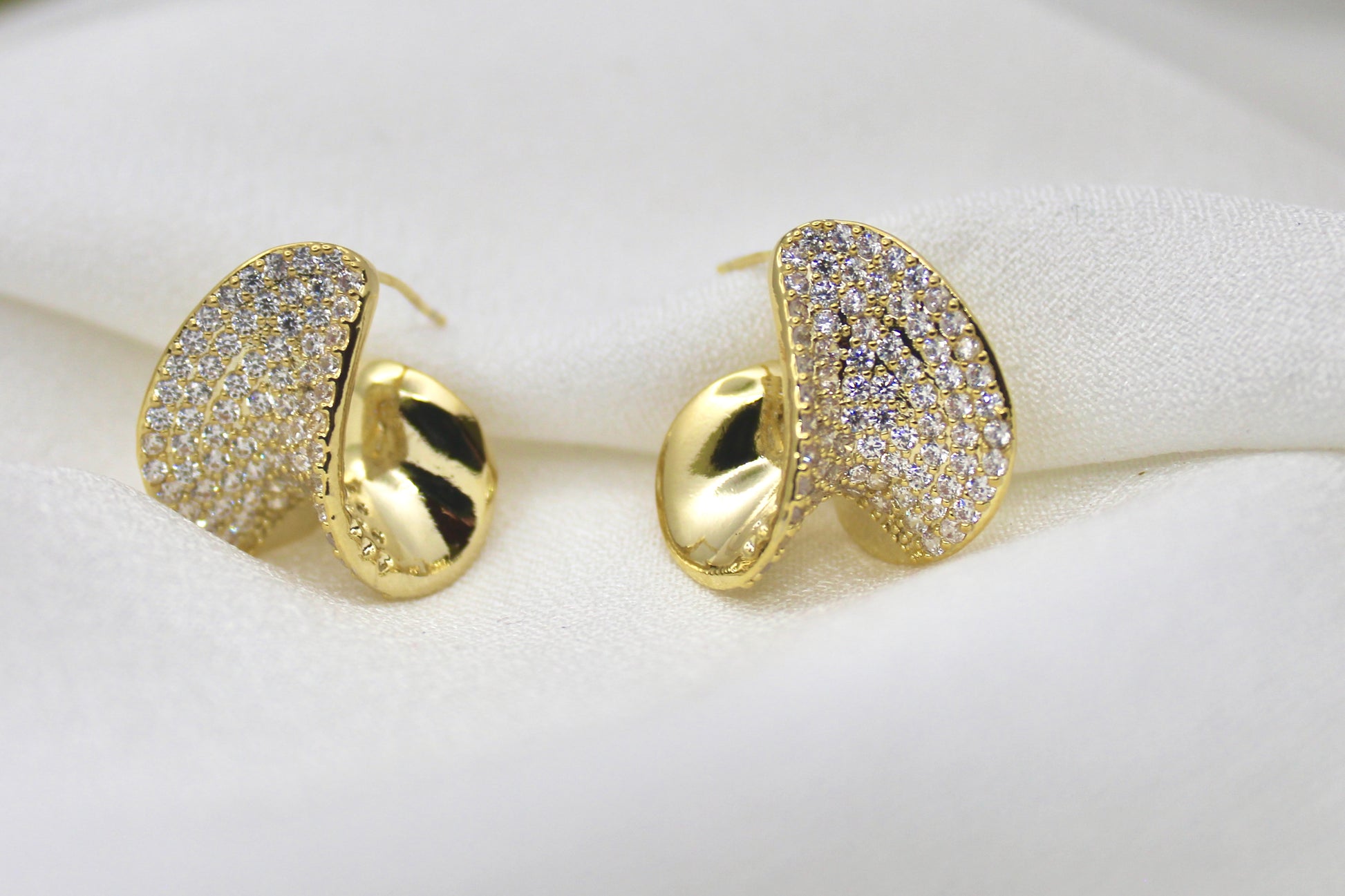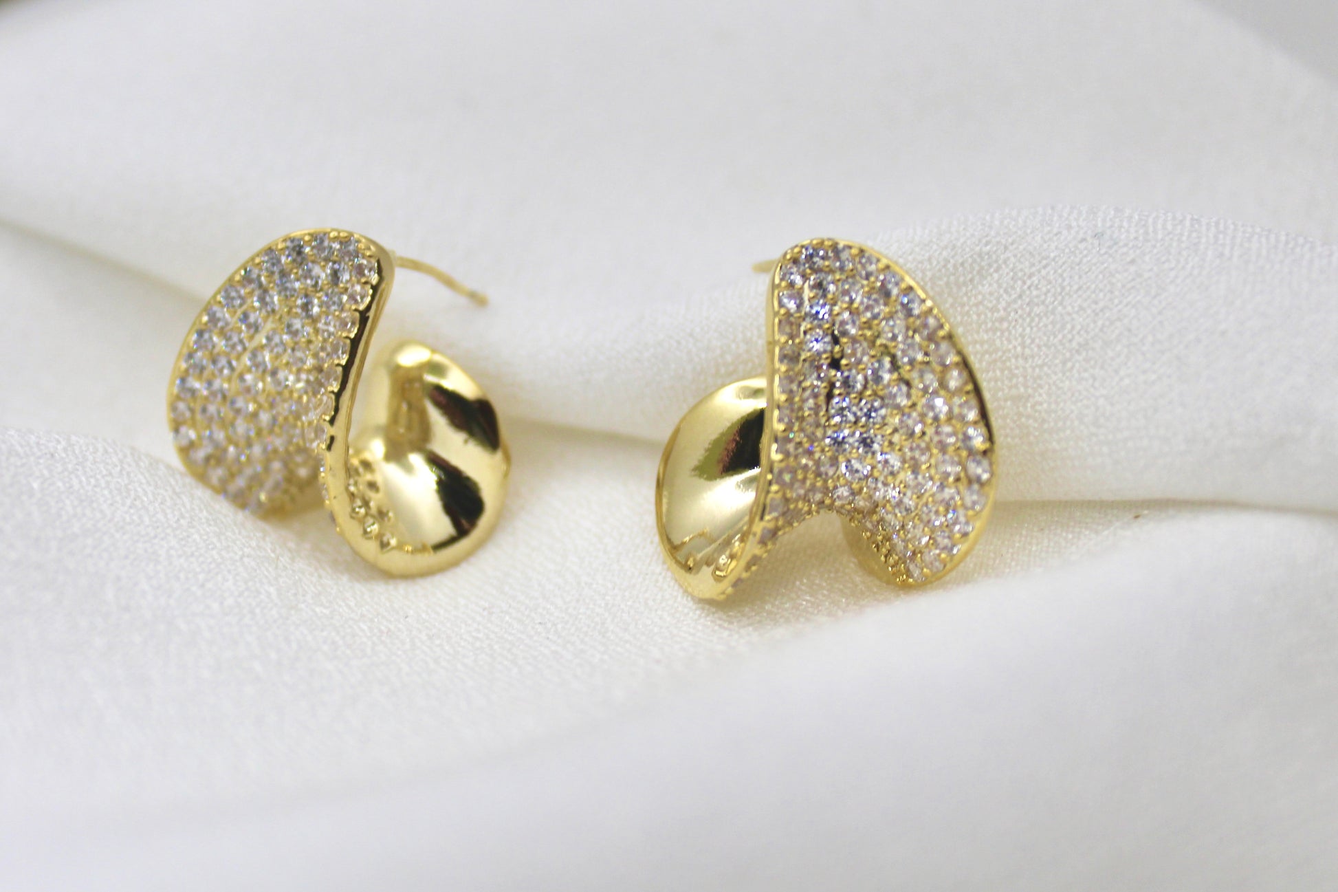 Turn heads with these sculpted pavé wave stud earrings, where modern artistry meets timeless sparkle. The fluid, wave-like shape is half-polished gold and half encrusted with dazzling stones, creating a captivating contrast. Perfect for adding a statement finish to both elegant and contemporary looks — these earrings effortlessly elevate any outfit.