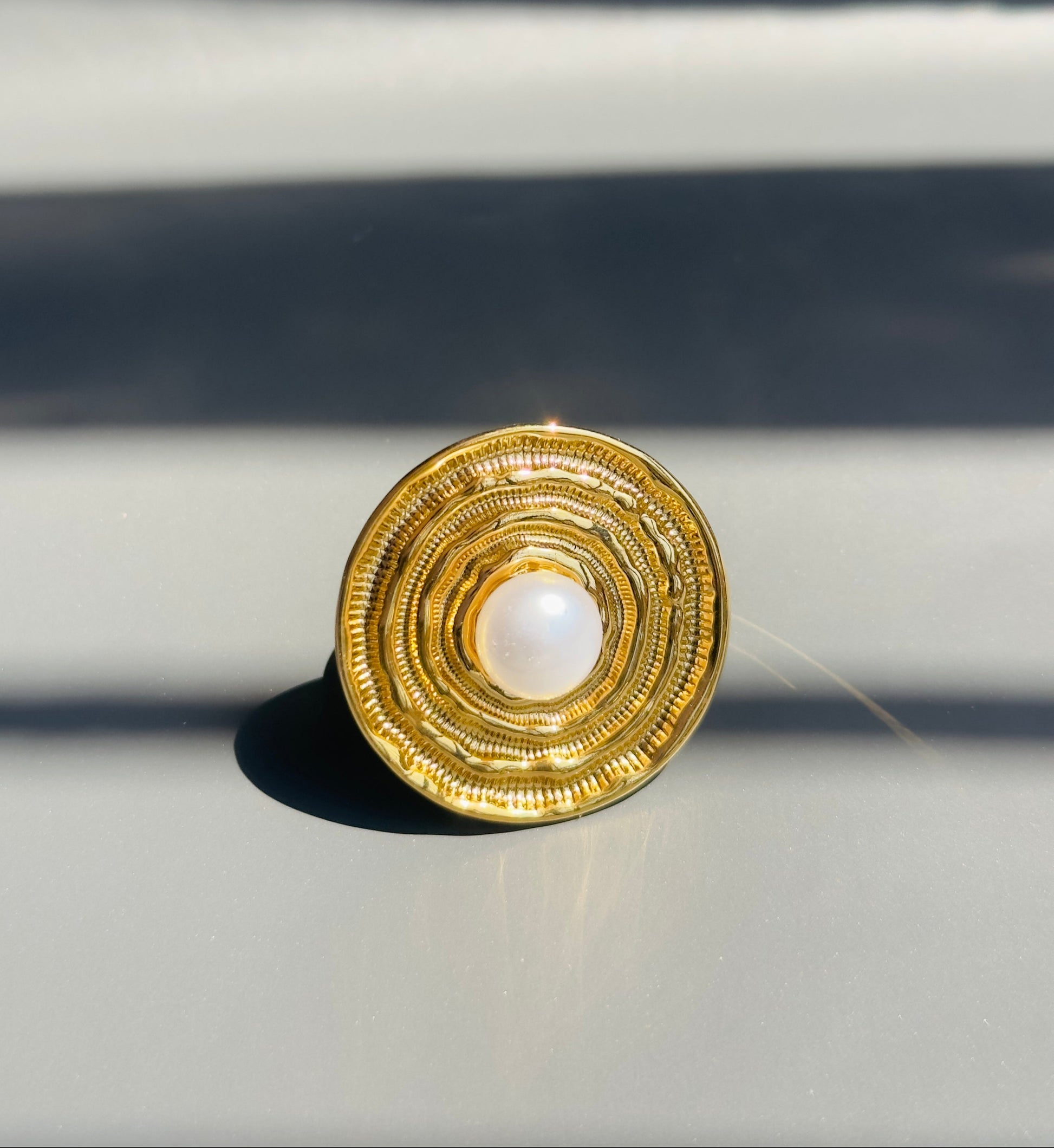 A chunky gold ring with orbit-like layers and a pearl center that shines like the sun. Bold, radiant, and made to stand out — just like you. ✨