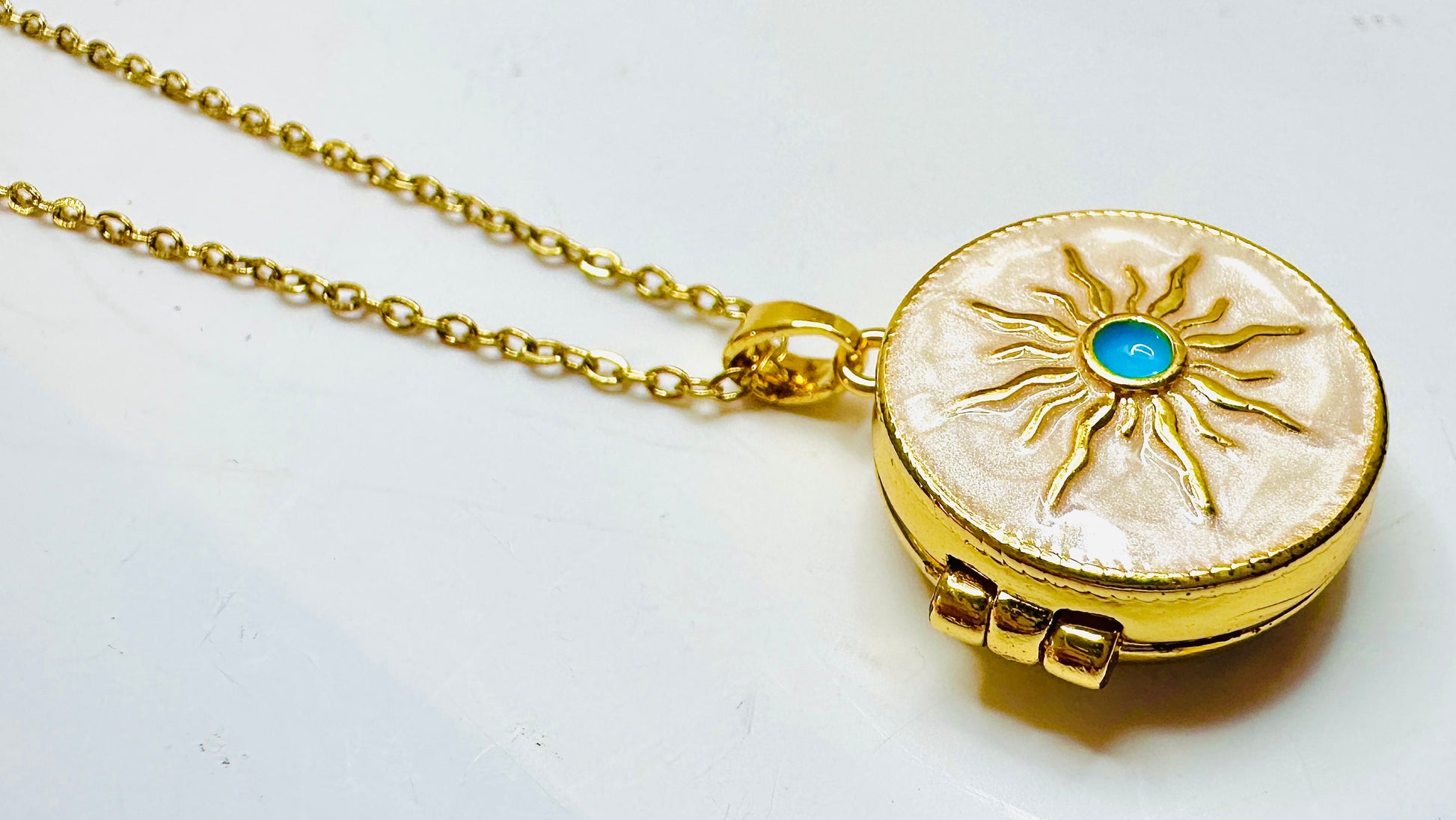 Carry a ray of sunshine with you wherever you go with our Sunburst White Necklace. Featuring a vibrant white enamel finish and a radiant sun motif ,this round locket opens to hold a special keepsake or memory. Perfect for layering or wearing solo, it brings warmth, positivity, and timeless style to your jewelry collection.