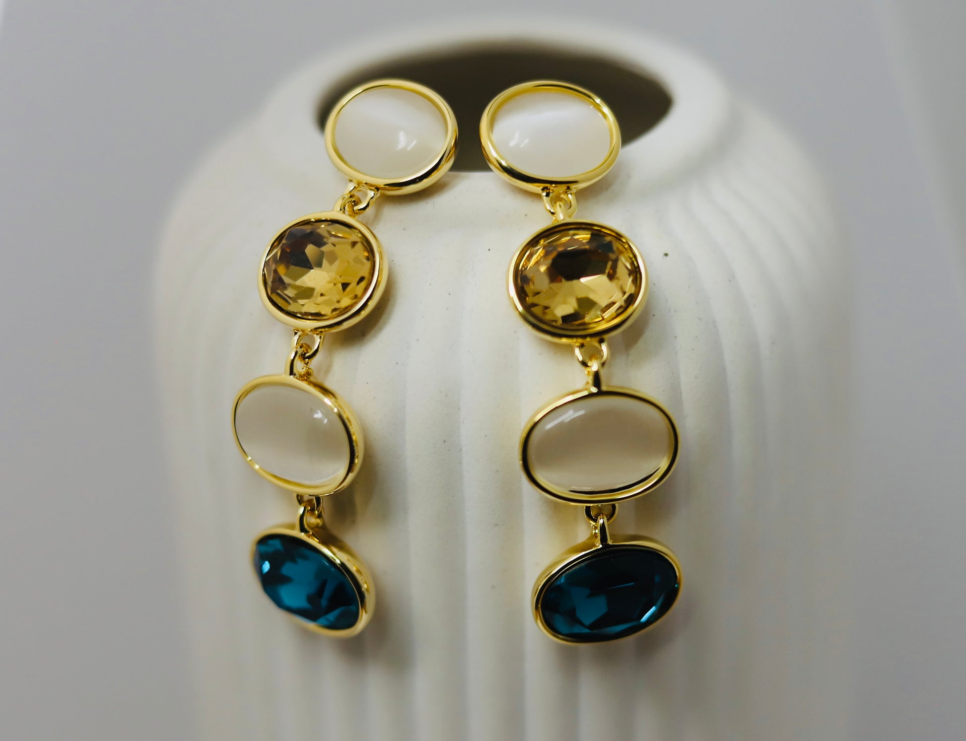 These elegant drop earrings feature a striking trio of gemstones in a vertical design. Each earring showcases a luminous pearl-white stone, a sparkling golden crystal, and a deep ocean-blue gem, all set in sleek gold-plated frames. The cascading arrangement creates a graceful movement, making them perfect for evening wear, festive occasions, or elevating a chic day look with a touch of sophistication.