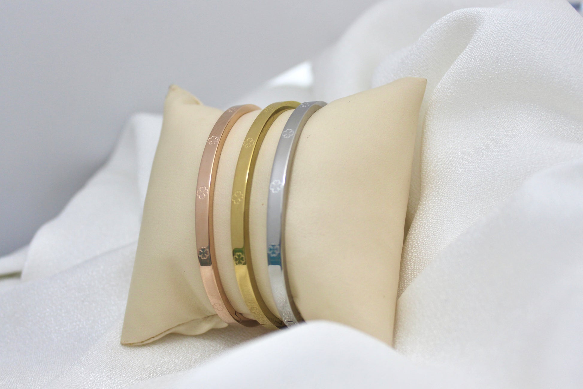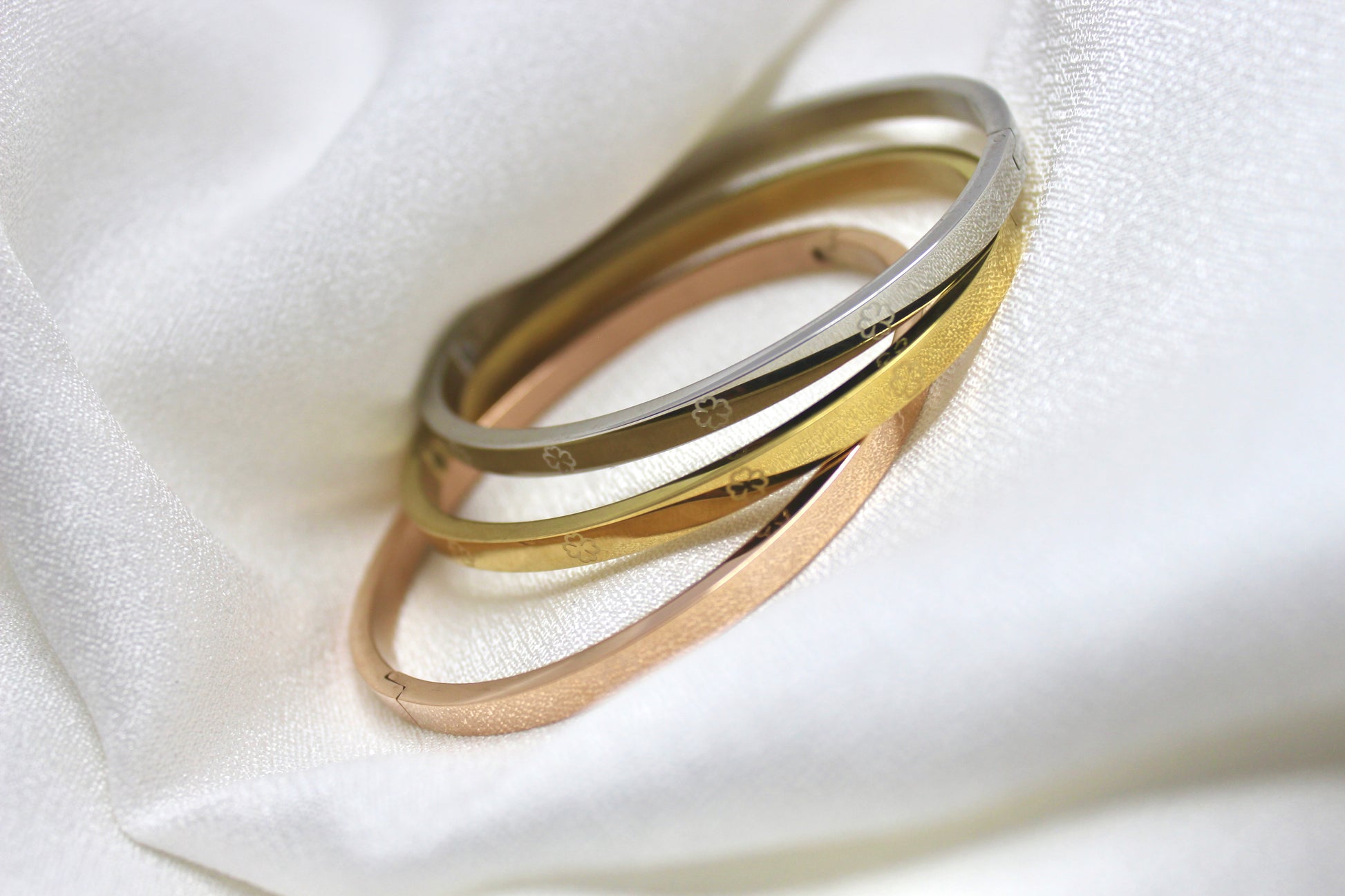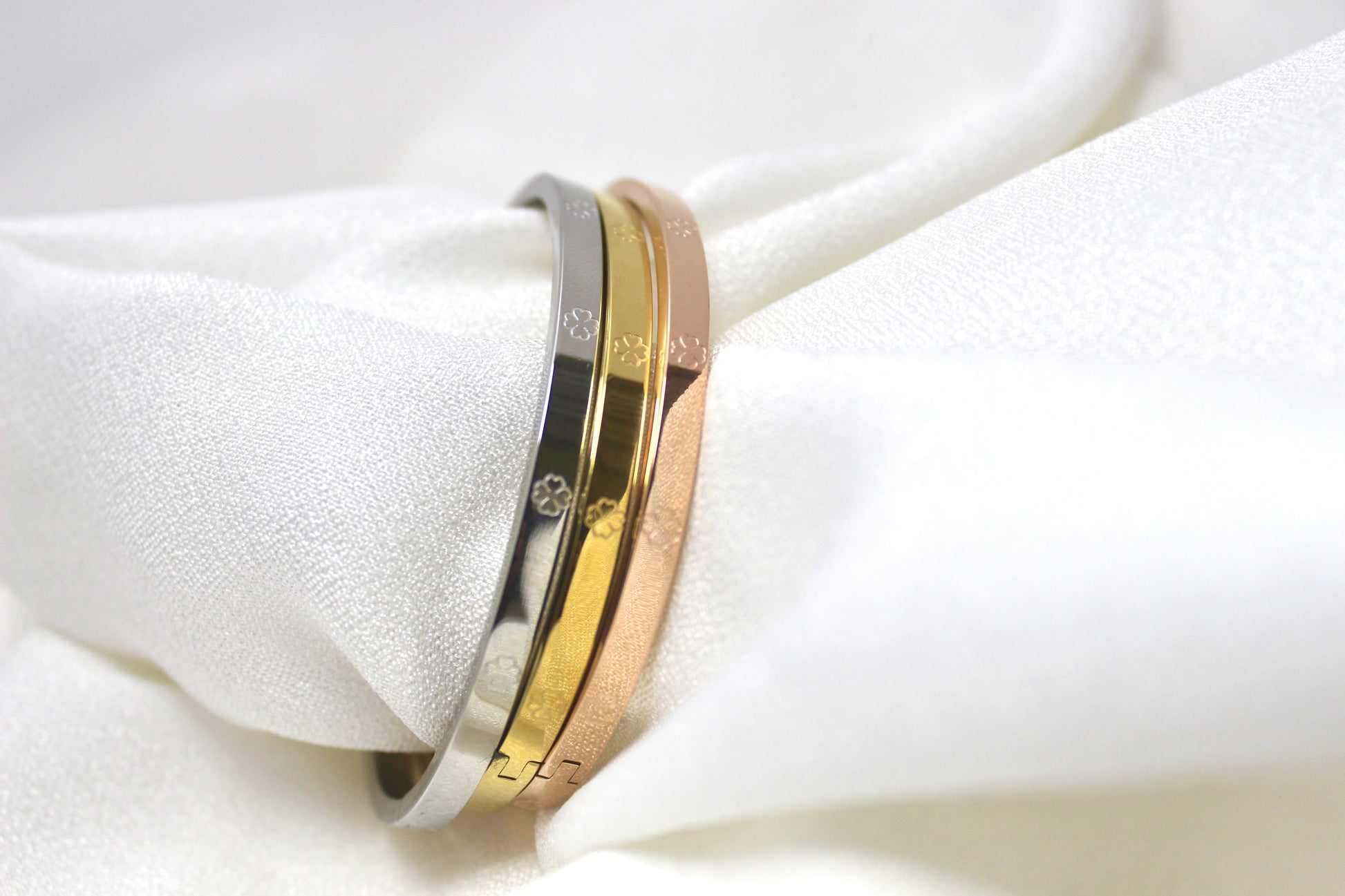 A sleek set of bracelets in rose gold, gold, and silver tones, each engraved with delicate floral motifs. Minimal yet chic, these versatile bracelets are perfect for stacking or styling solo, giving your look a polished and modern touch.