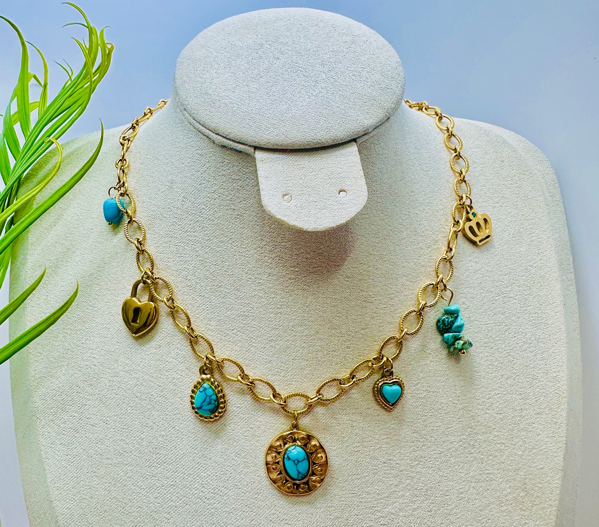 Elevate your everyday look with our Golden Aura Turquoise Charm Necklace. Crafted with a sleek gold-plated chain, this necklace features an array of turquoise charms and delicate gold accents, including hearts, a lock, and a crown. Perfect for layering or wearing as a statement piece, it combines elegance with a modern, bohemian touch.